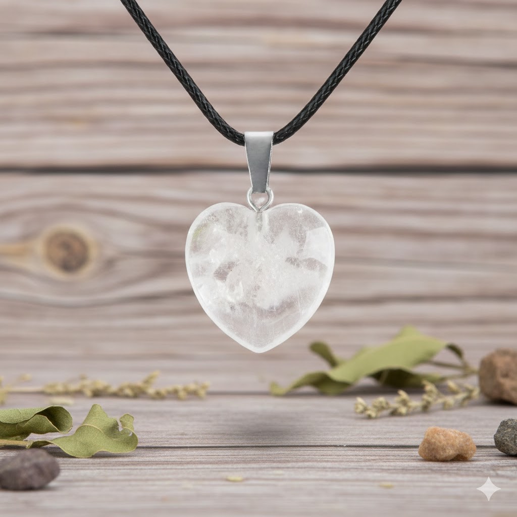 Naszyjnik z zawieszką w kształcie serca wykonany z naturalnego kryształu górskiego to elegancka i symboliczna biżuteria, która zachwyca swoją prostotą i wyjątkową formą. Przejrzystość kamienia sprawia, że każdy egzemplarz jest niepowtarzalny – widoczne są w nim naturalne struktury i refleksy światła.