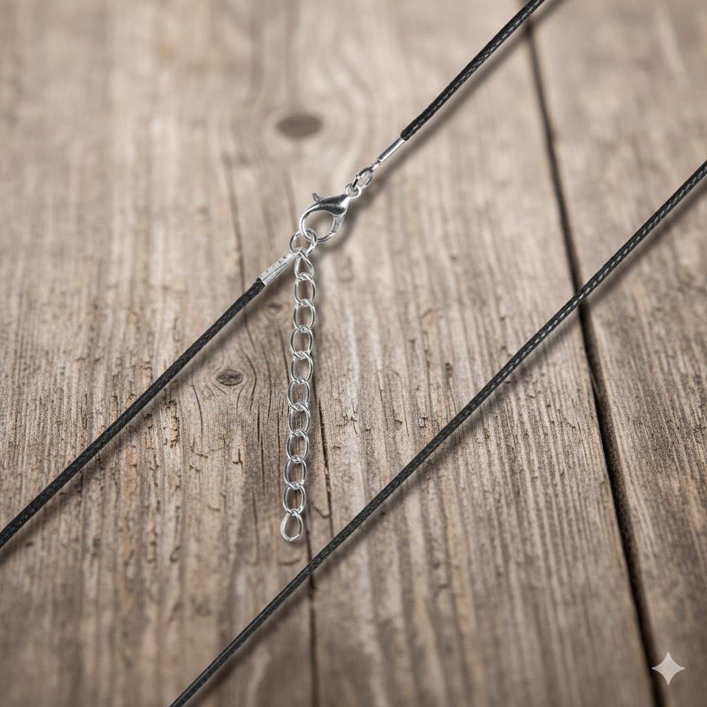 Zawieszka została osadzona w metalowej oprawie i umieszczona na czarnym sznurku z wygodnym zapięciem oraz możliwością regulacji długości. Naszyjnik pasuje do codziennych stylizacji, ale również świetnie sprawdzi się jako drobny, pełen znaczenia upominek dla bliskiej osoby.