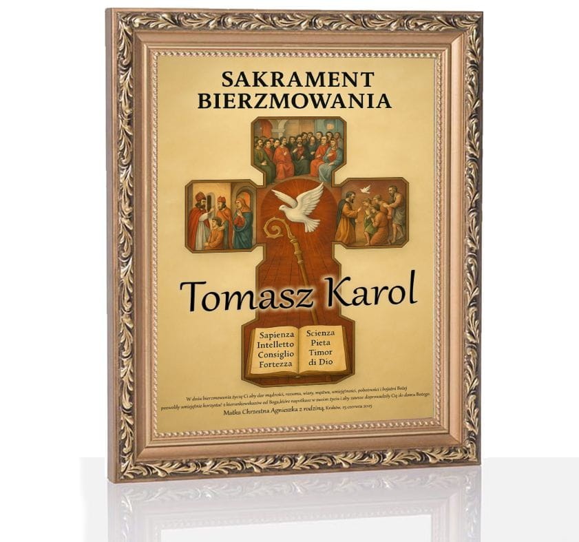 Bierzmowanie to sakrament, który dopełnia łaskę Chrztu i umacnia w wierze – dlatego warto uczcić ten dzień symbolem, który będzie przypominał o działaniu Ducha Świętego i duchowym dojrzewaniu. Obraz stanowi piękny prezent od rodziców chrzestnych, dziadków lub bliskich – nie tylko efektowny wizualnie, ale przede wszystkim głęboko symboliczny.
