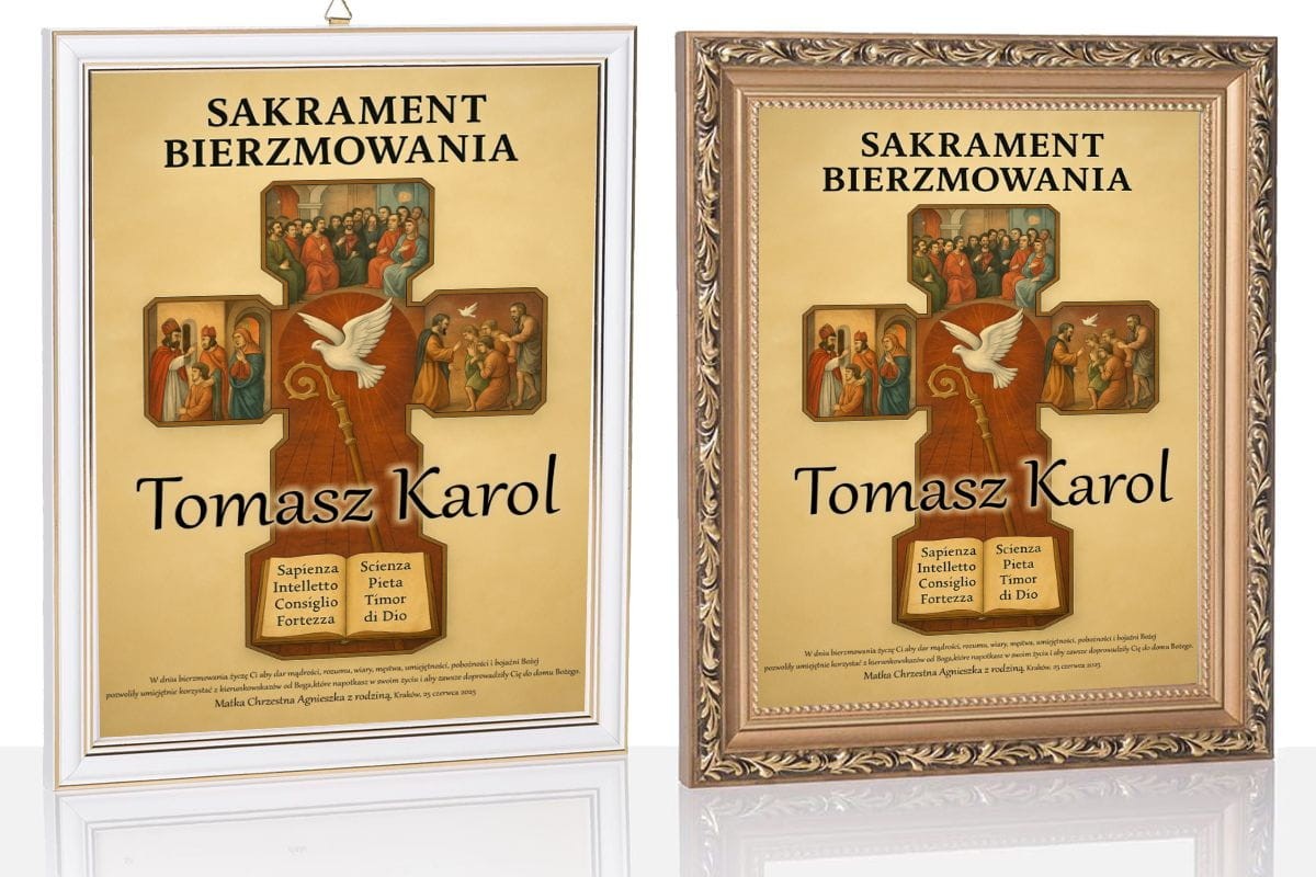 Elegancki obraz upamiętniający Sakrament Bierzmowania, wykonany na szkle z trwałym nadrukiem UV, to wyjątkowa pamiątka jednego z najważniejszych duchowych momentów w życiu młodego chrześcijanina. Nowoczesna tafla szkła nadaje obrazowi lekkości i głębi, a możliwość wyboru ramy – klasycznej białej lub dekoracyjnej vintage – pozwala dopasować go do każdego wnętrza.