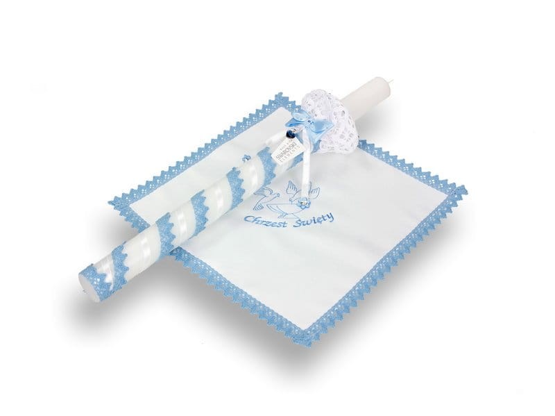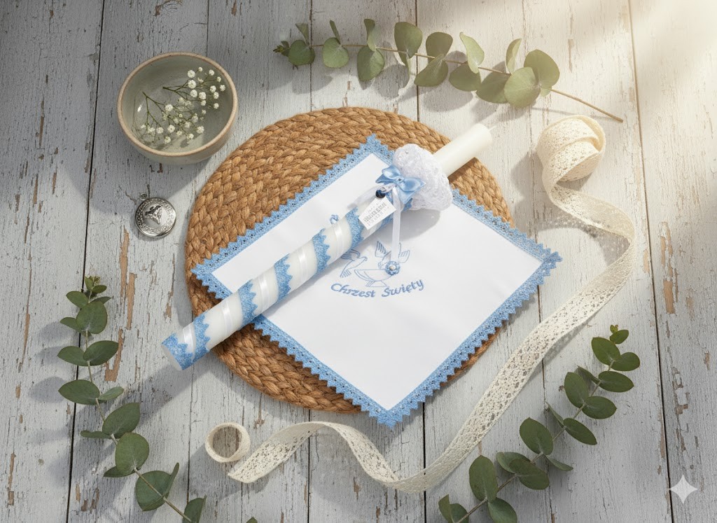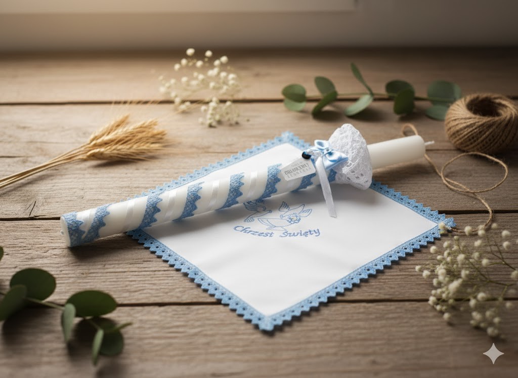 Szatka i świeca zdobione są koronką bawełnianą oraz ręcznie aplikowanymi kryształkami Swarovski, które nadają całości subtelnego blasku i wyrafinowanej elegancji. Możliwość personalizacji szatki imieniem dziecka sprawia, że zestaw nabiera osobistego, głęboko symbolicznego wymiaru – staje się pamiątką na całe życie.