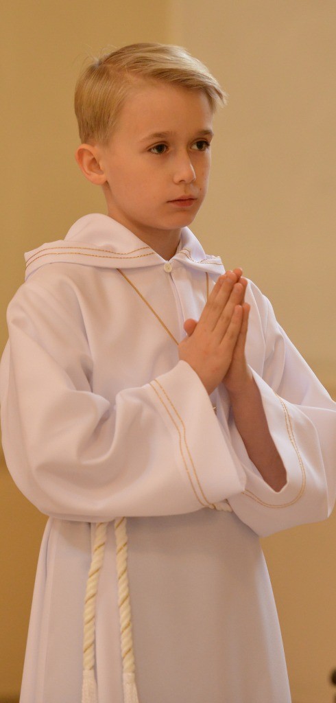 Materiał jest lekki, przewiewny i odporny na zagniecenia, co gwarantuje wygodę w trakcie uroczystości oraz pamiątkowych zdjęć. Alba doskonale podkreśla powagę i duchowy wymiar sakramentu, stanowiąc piękne odzwierciedlenie symboliki bieli – czystości serca i nowego życia w Chrystusie.