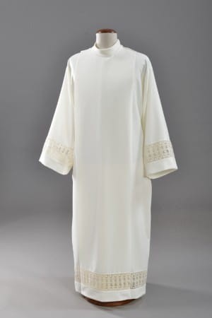 Alba kapłańska z tropiku, w kolorze ecru, zdobiona wstawką; krój rzymski, zamek na ramieniu.