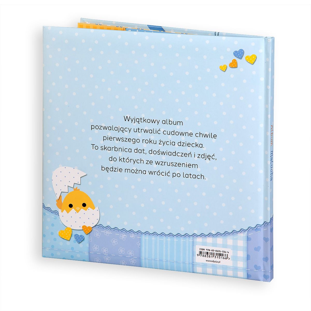 W albumie znajdziesz miejsce na zapisanie ważnych dat, doświadczeń i wydarzeń oraz kolorowe ramki na zdjęcia dokumentujące pierwszy rok życia, do których ze wzruszeniem będzie można wrócić po latach.