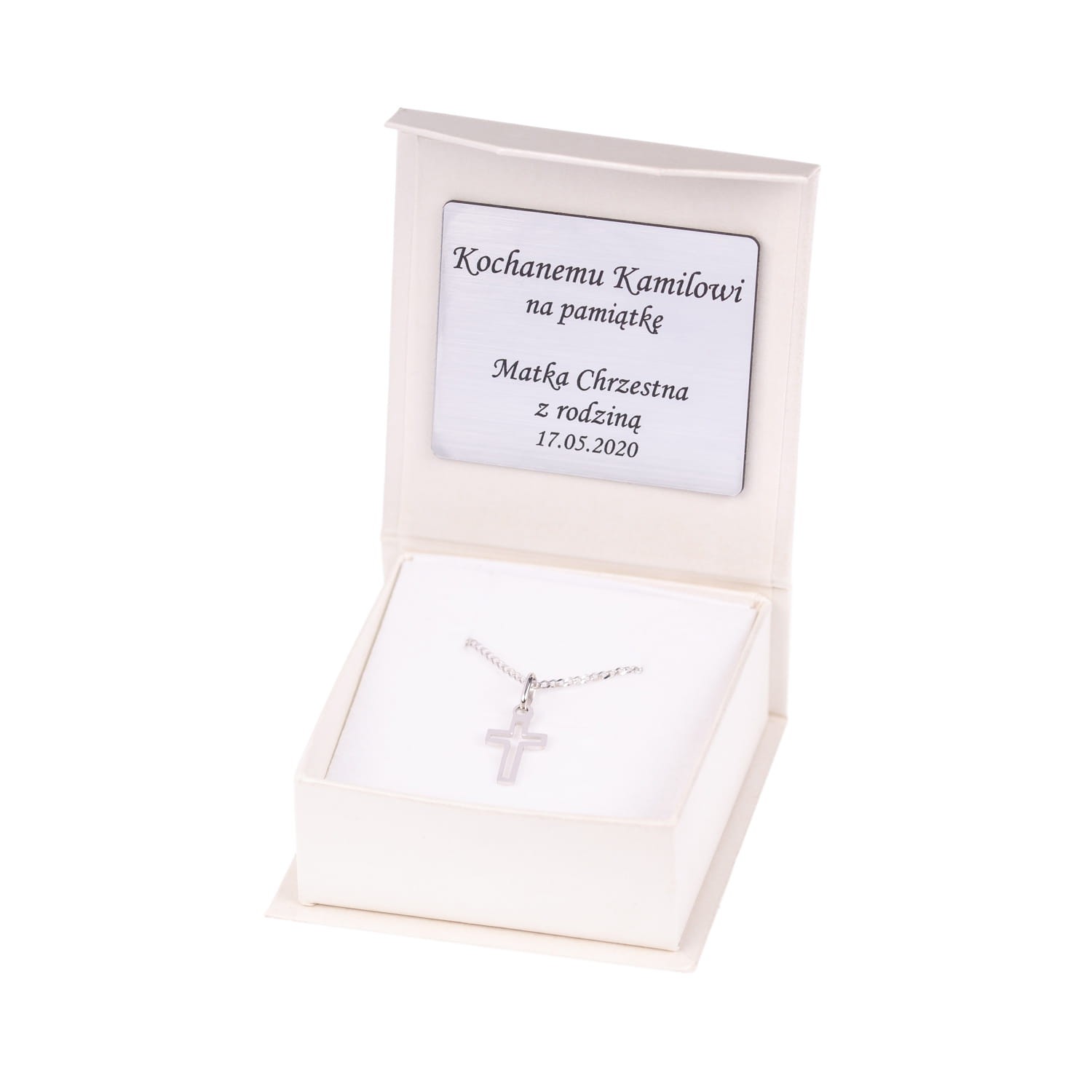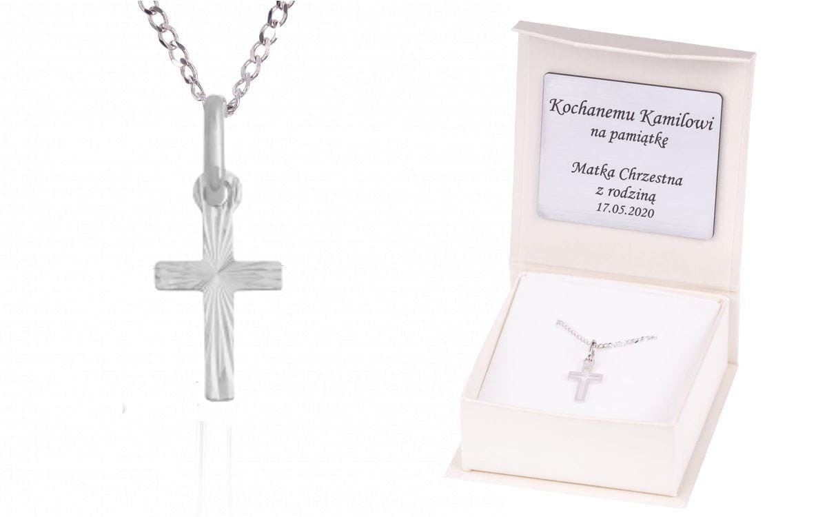 Medalik krzyżyk BIAŁE ZŁOTO na łańcuszku (pr.585) w pudełeczku z grawerem