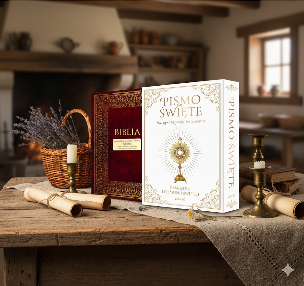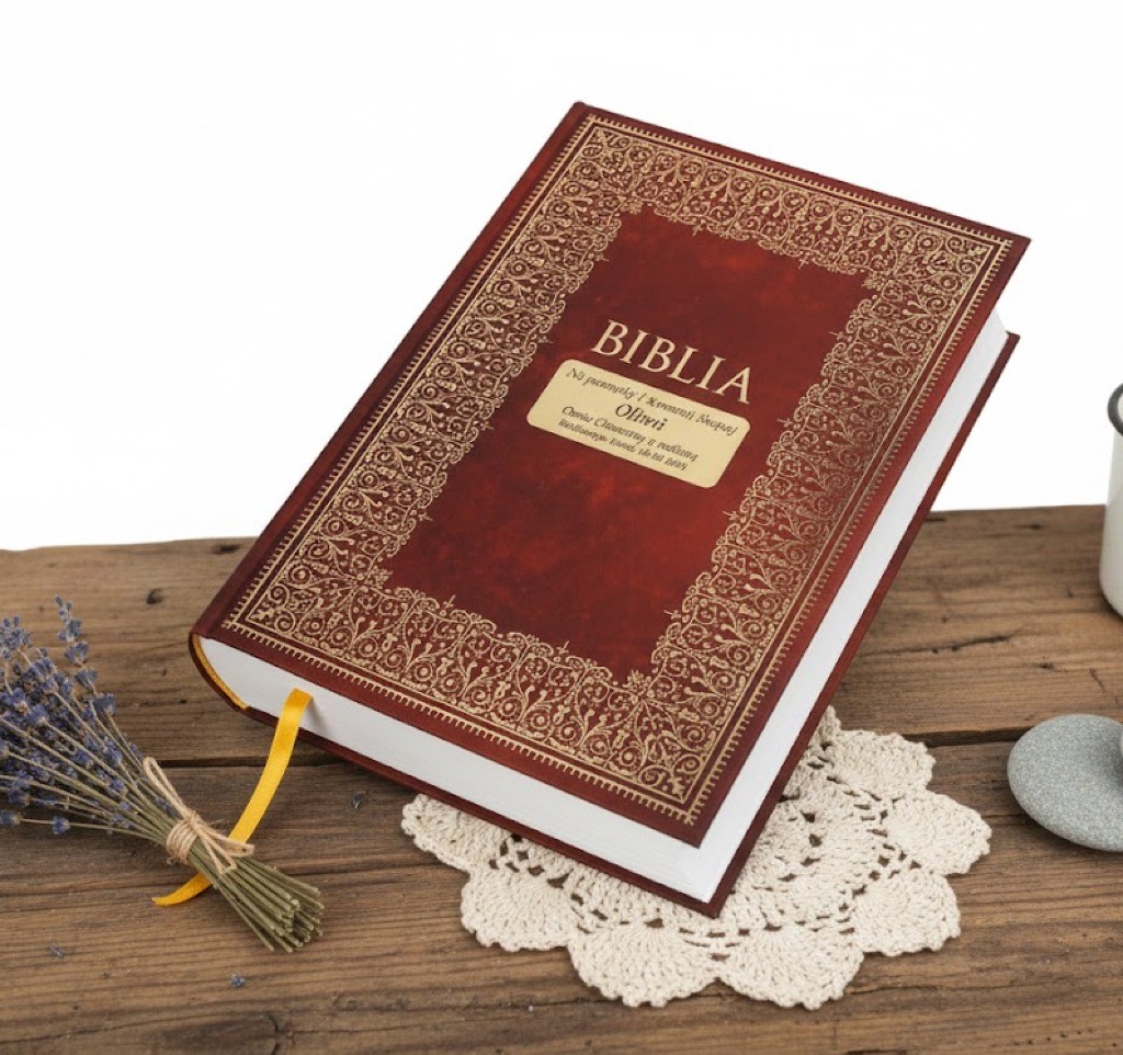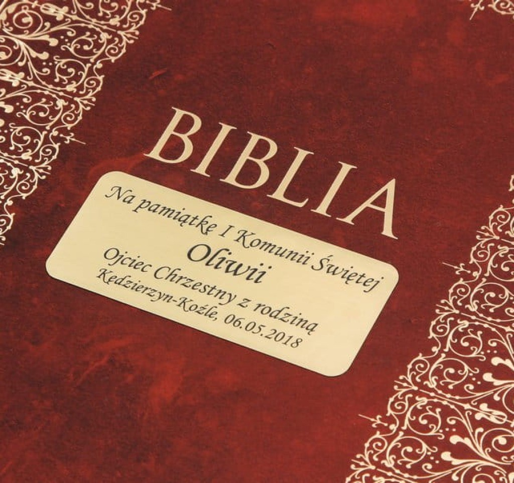 Biblia oprawiona jest w twardą, bogato zdobioną okładkę z ornamentami inspirowanymi stylistyką klasyczną. Na okładce umieszczana jest dedykacja wykonana na złotym laminacie, zawierająca imię dziecka oraz okazję I Komunii Świętej. Całość uzupełnia białe, pamiątkowe etui z motywem komunijnym, które chroni księgę i porządkuje jej przechowywanie.