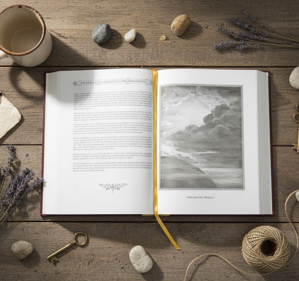 Wnętrze Biblii zawiera rozbudowaną część ilustracyjną oraz specjalne strony przeznaczone do zapisywania ważnych wydarzeń rodzinnych, dzięki czemu może pełnić również funkcję domowej kroniki.