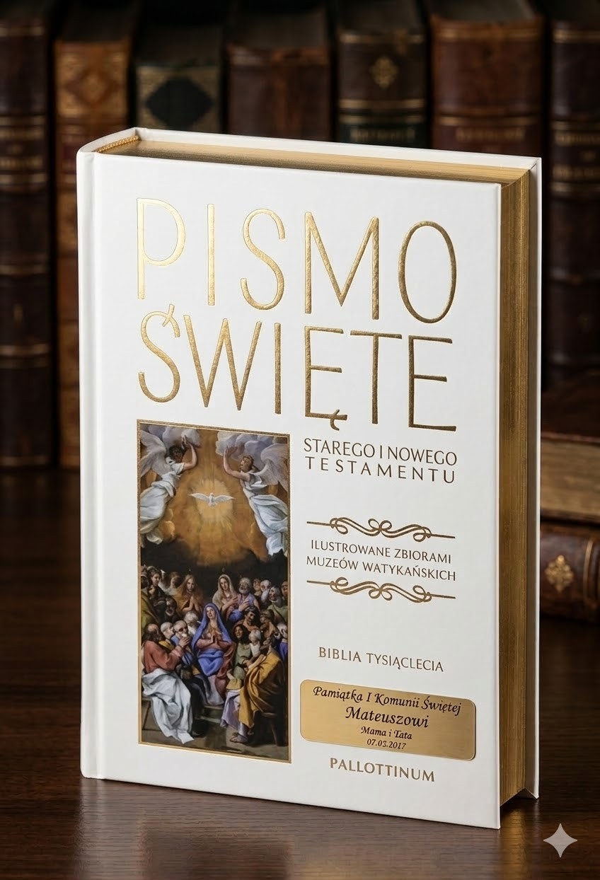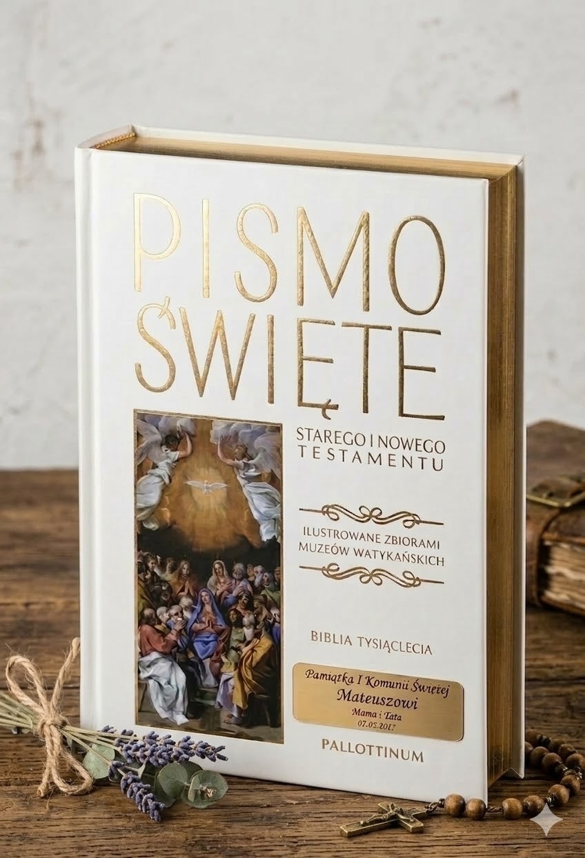Biblia Tysiąclecia w eleganckiej oprawie to wyjątkowe wydanie Pisma Świętego Starego i Nowego Testamentu, przygotowane jako pamiątka Pierwszej Komunii Świętej. Publikacja zawiera tekst piątego wydania Biblii Tysiąclecia, zatwierdzony przez Konferencję Episkopatu Polski do użytku liturgicznego.