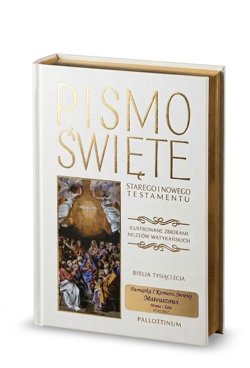 Biblia Tysiąclecia – Pismo Święte w białej oprawie z grawerem