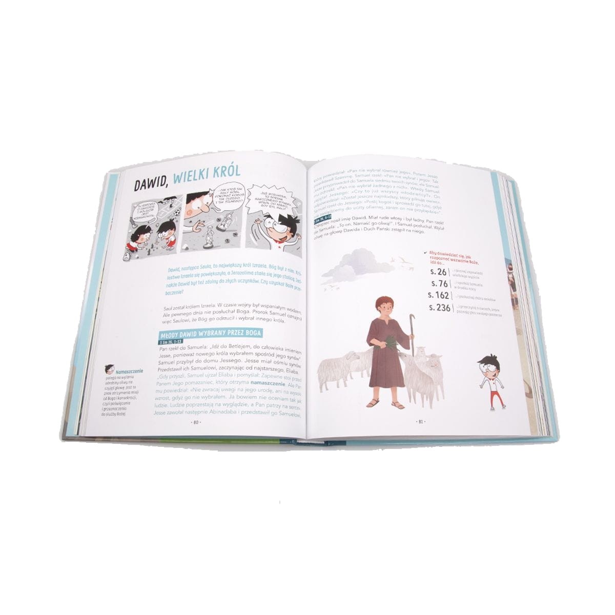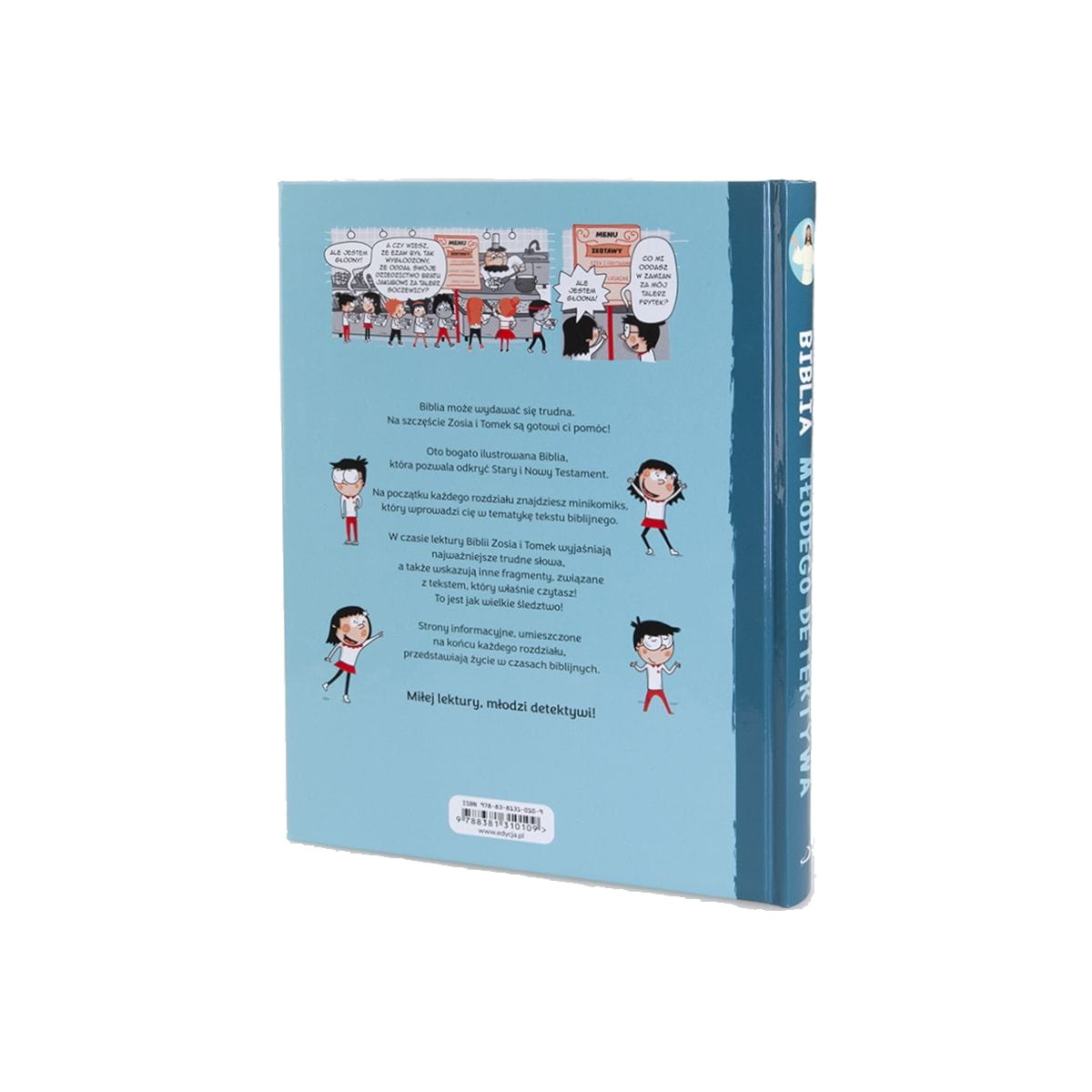 Jak przedstawić Biblię, aby nie wydawała się dzieciom zbyt długa i trudna? Pomogą nam w tym sympatyczni detektywi: Zosia i Tomek. Biblia młodego detektywa zawiera 14 najpopularniejszych historii ze Starego Testamentu i 14 z Nowego Testamentu. Na początku każdego rozdziału znajduje się minikomiks z zabawnymi dialogami, który wprowadza czytelników w tematykę tekstu biblijnego. Obok opowieści biblijnej, napisanej przystępnym językiem, znajduje się fragment oryginalnego tekstu, aby przyzwyczajać najmłodszych do lektury Pisma Świętego. Na marginesach książki Zosia i Tomek wyjaśniają najważniejsze trudne słowa, a także wskazują inne fragmenty biblijne, związane z czytanym tekstem. Ponadto na końcu każdego rozdziału znajdują się strony informacyjne z bardzo ciekawymi wiadomościami i ilustracjami. Lektura Biblii młodego detektywa jest jak wielkie śledztwo! Jeśli chcesz poznać historie niezwykłych postaci, dołącz do Zosi i Tomka i odkryj Pismo Święte.