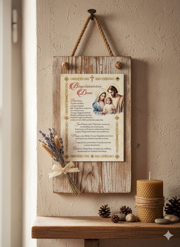 W centralnym miejscu umieszczona została modlitwa Błogosławieństwo Domu, którą można wykorzystać podczas codziennej modlitwy rodzinnej. Wyrazista grafika, czytelna czcionka oraz staranne wykonanie sprawiają, że obrazek nie tylko pięknie się prezentuje, ale także inspiruje do modlitwy i budowania atmosfery wiary w rodzinie.