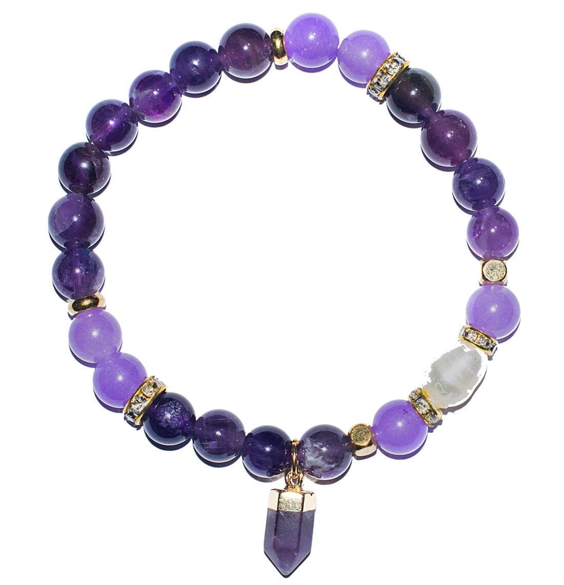 Bransoletka dla kogoś wyjątkowego wykonana z kamieni półszlachetnych – ametystu, który jest kryształem harmonii i relaksu otulającym Cię swą ochroną i otaczający poczuciem spokoju i pogody ducha. Bransoletka posiada również zawieszkę – grot ametystowy, perłę symbolizującą czystość, harmonię i pokorę oraz piękne, błyszczące koraliki.
