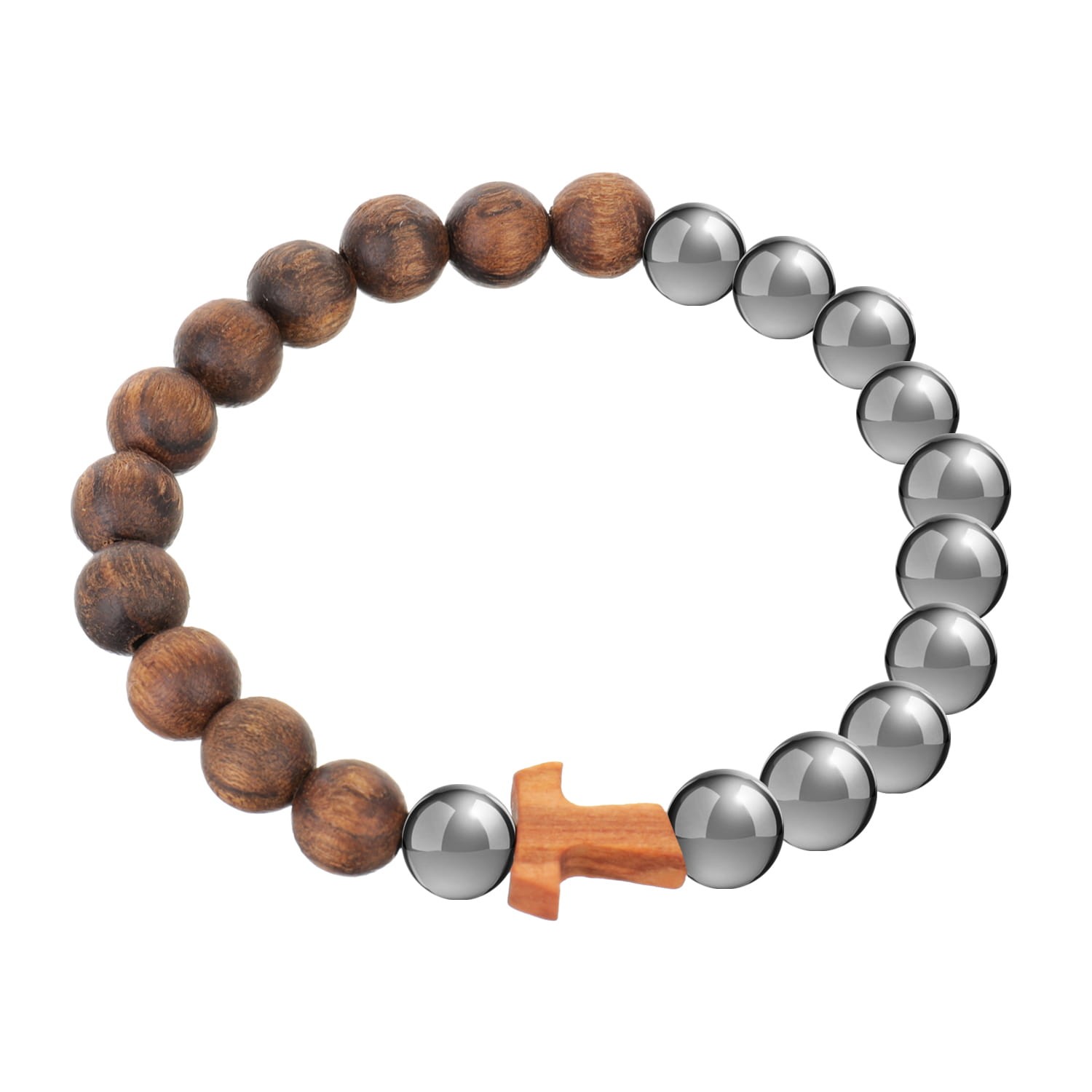 Bransoletka osadzona na sznurku elastycznym, krzyżyk wykonany z drzewa oliwnego produkcji włoskiej.