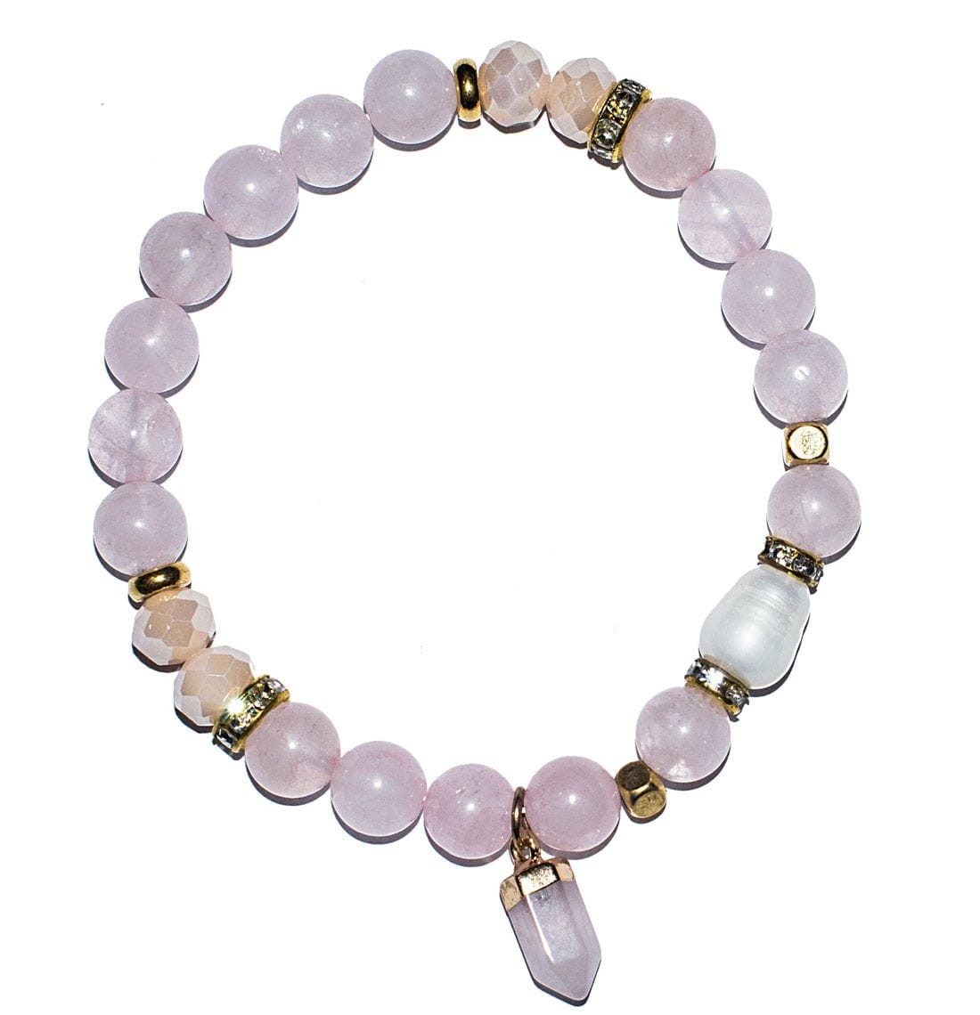 Ręcznie wykonana bransoletka z naturalnych kamieni półszlachetnych: kwarcu różowego, kryształu górskiego oraz perły. Całość uzupełniona błyszczącymi koralikami, które nadają kompozycji subtelny połysk i elegancję.