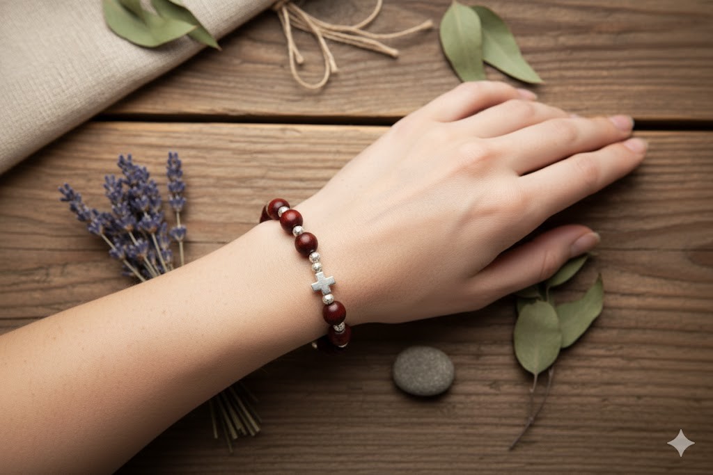 Forma koralików, sprawdzi się również jako 10tka różańca, gdyż każdy ręcznie wykonany posiada przekładki z kamieni naturalnych oraz krzyżyka wykonanego z Hematytu.