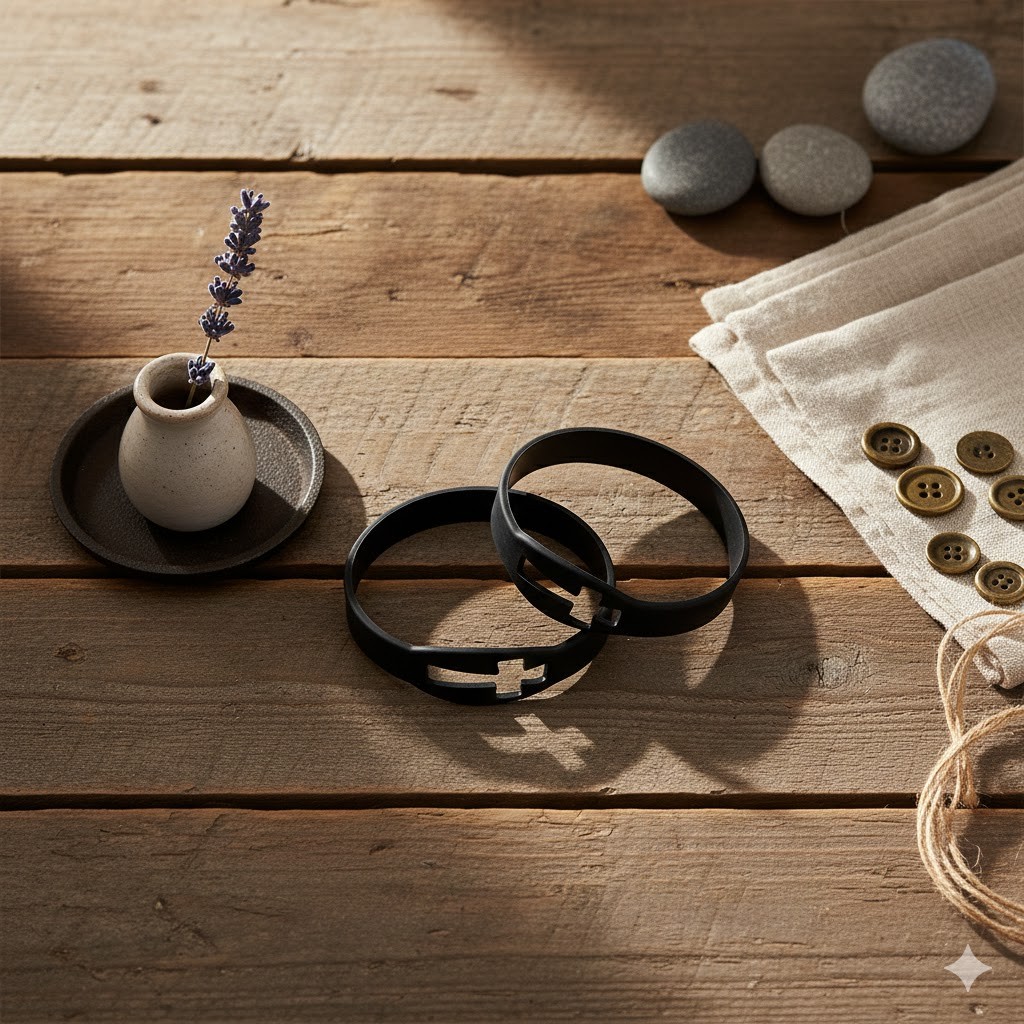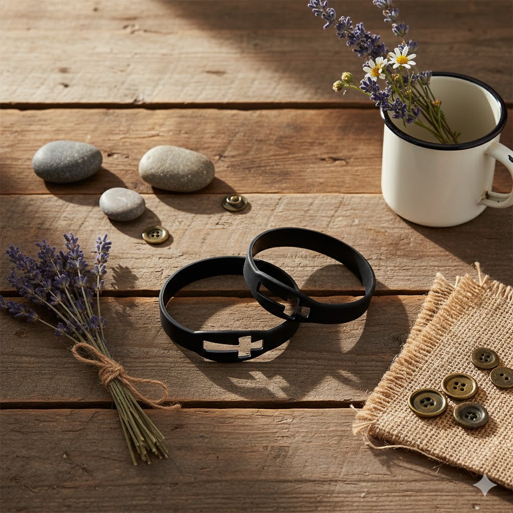 Bransoletka wykonana została z elastycznego, trwałego silikonu, dzięki czemu jest wygodna w noszeniu i odporna na codzienne użytkowanie. Sprawdzi się zarówno u młodzieży, jak i dorosłych – jako osobisty znak wiary lub dyskretny element duchowej tożsamości.