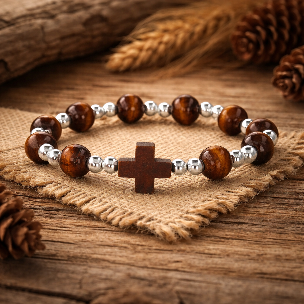 Bransoletka z drewnianym krzyżykiem i kulkami – styl i duchowość w jednym