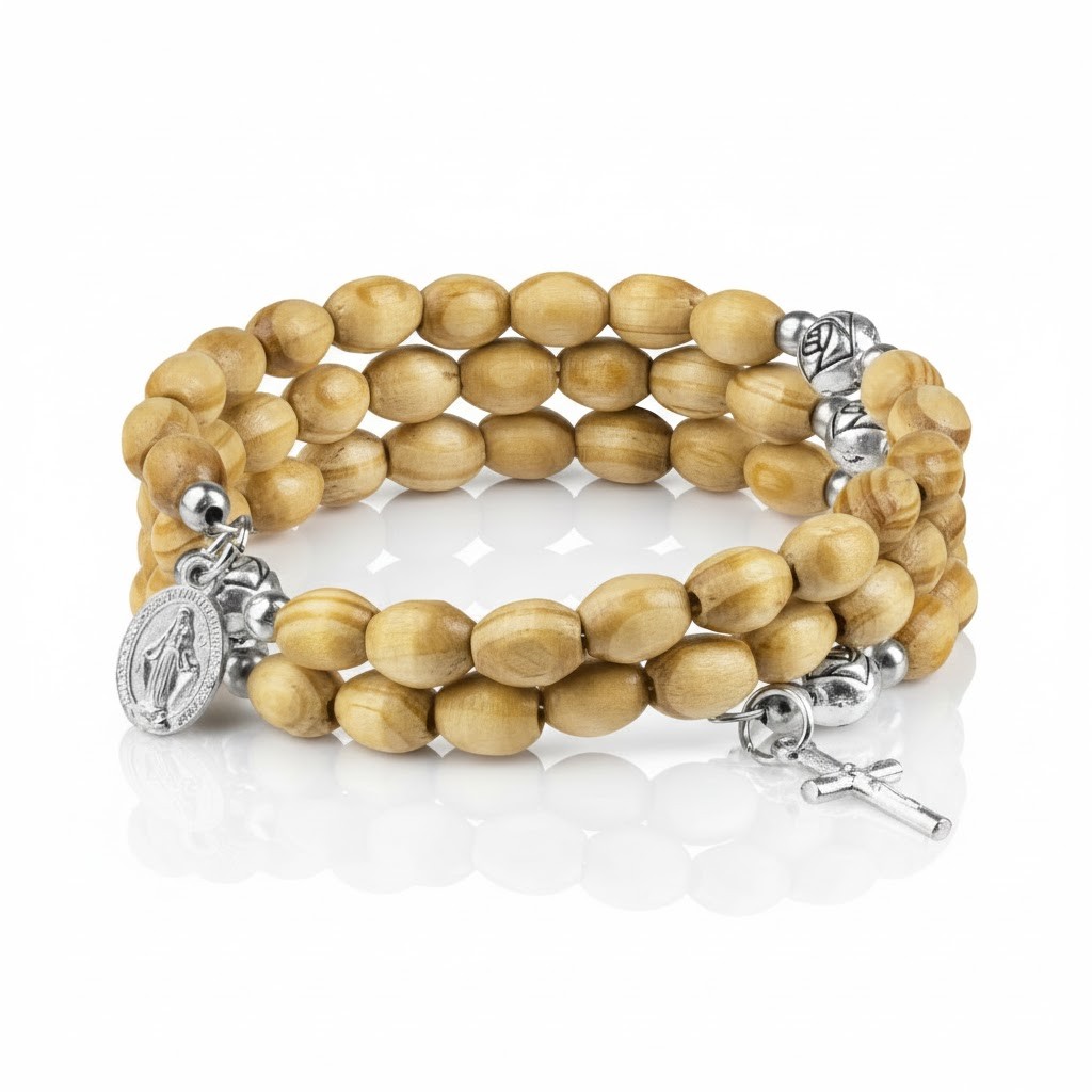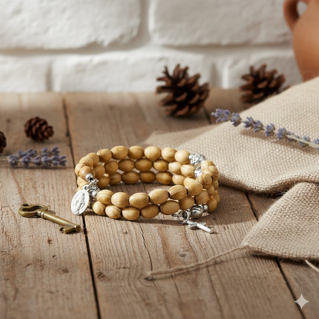 Klasyczna bransoletka różańcowa, która łączy w sobie duchowy wymiar modlitwy z elegancką, codzienną formą biżuterii. Drewniane koraliki o naturalnej barwie i delikatnym połysku nadają jej ponadczasowy charakter, a sprężyste oplecenie sprawia, że dopasowuje się do każdego nadgarstka.