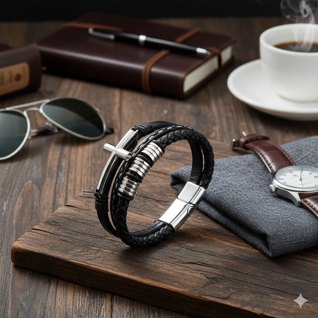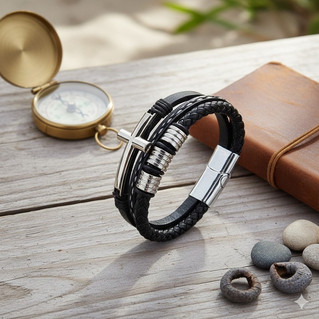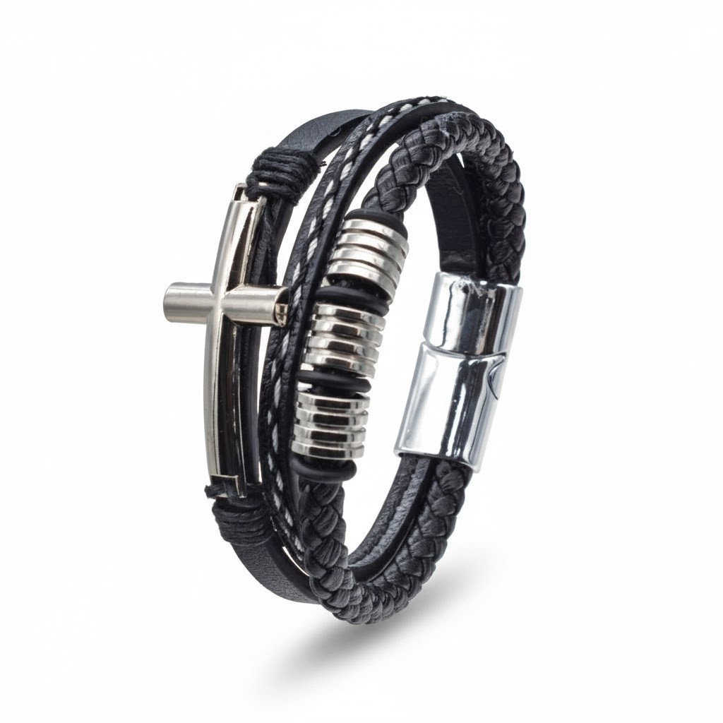 Stylowa męska bransoletka, łącząca symbol wiary z nowoczesnym wzornictwem. Wykonana z wysokiej jakości, plecionej skóry ekologicznej w kolorze głębokiej czerni, która doskonale kontrastuje z metalicznymi akcentami. Centralny element biżuterii stanowi ozdobny krzyż w kolorze srebrnym — subtelny, a jednocześnie wyrazisty znak chrześcijańskiej tożsamości.