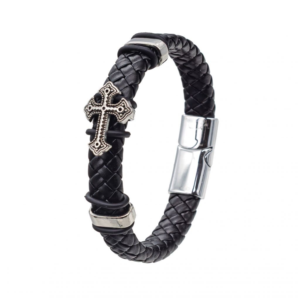 Stylowa i elegancka bransoletka wykonana z wysokiej jakości czarnej, plecionej skóry ekologiczne. Jej centralnym elementem jest ozdobny krzyż w kolorze srebrnym, symbolizujący wiarę siłę i ponadczasowe wartości.