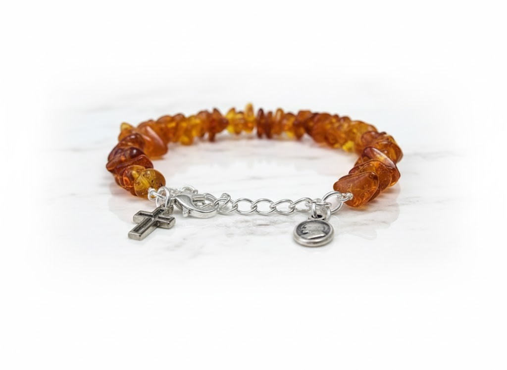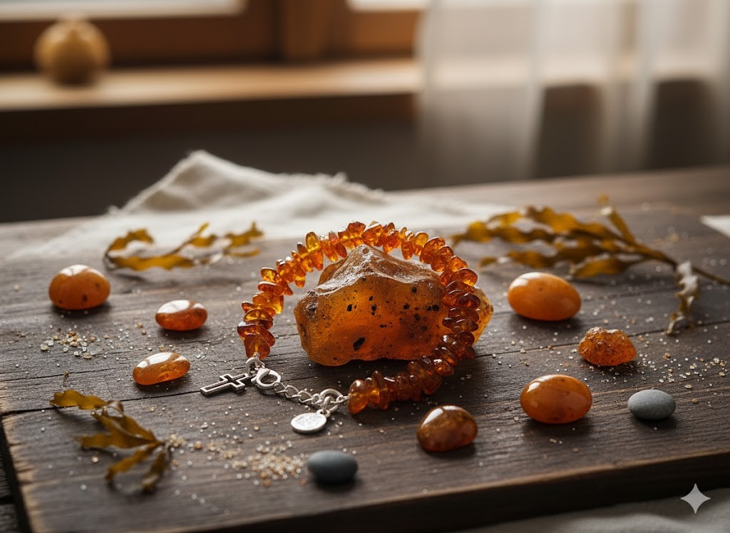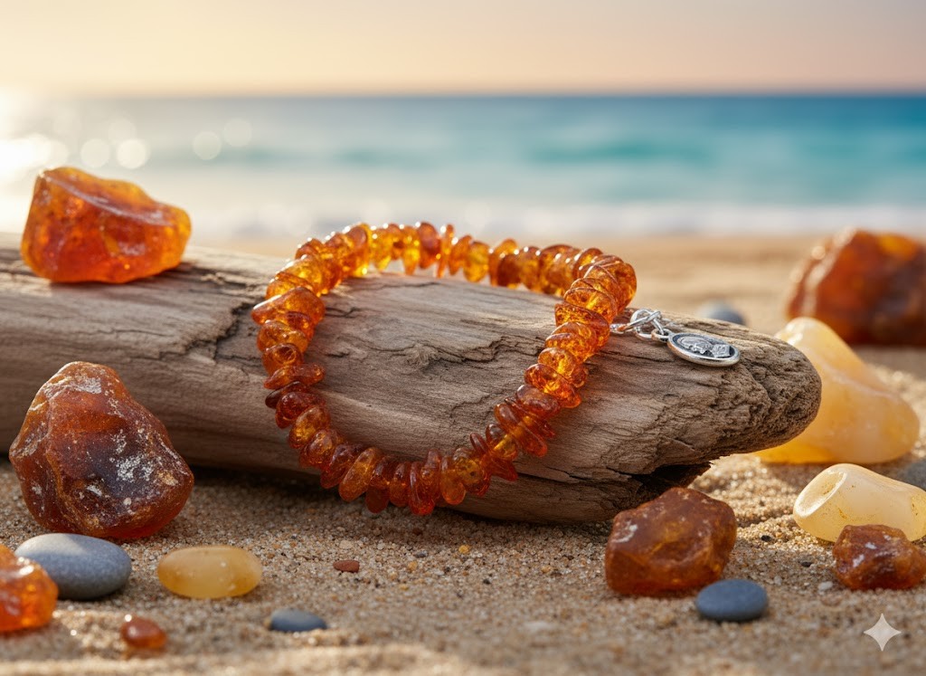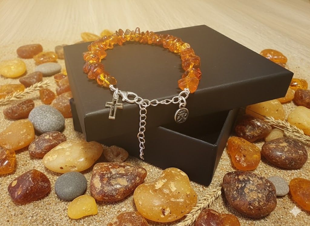 Bursztyn od wieków uznawany jest za kamień mocy i ochrony. Łączy się go z działaniem wyciszającym, wspierającym odporność oraz łagodzącym stres. Naturalny, nieprasowany bursztyn zawiera wyższe stężenie kwasu bursztynowego, którego działanie najlepiej aktywuje się w kontakcie ze skórą.