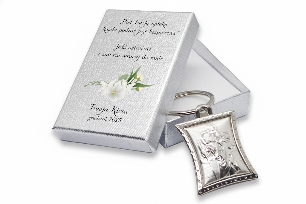 Brelok Święty Krzysztof – laminowany srebrem, próba 925, w srebrnym pudełeczku z nadrukiem UV