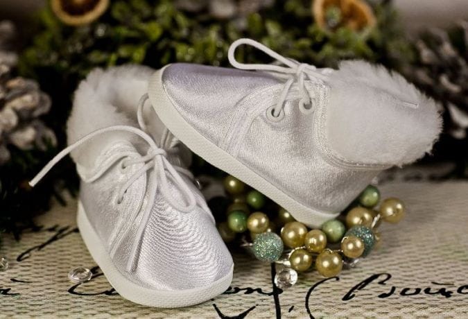 Eleganckie, zapinane na rzep, buciki z białego atłasu.