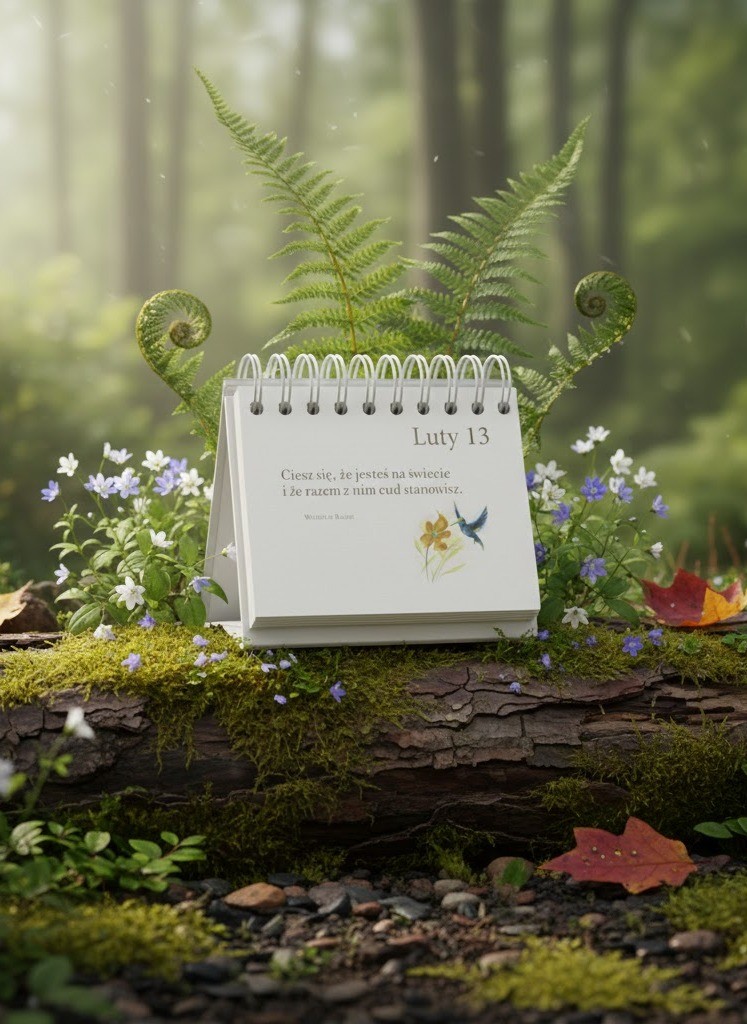 Codziennik posiada spiralną oprawę, dzięki której wygodnie przekłada się kolejne karty, a zintegrowana tekturowa podstawka umożliwia ustawienie go na biurku — w domu, pracy, gabinecie czy miejscu modlitwy. To przedmiot, który sprawia, że każdy poranek zaczyna się od światła, pokoju i dobrego słowa.
