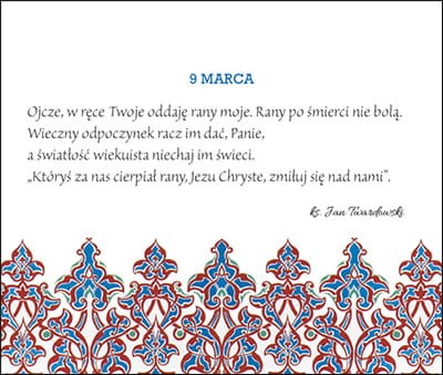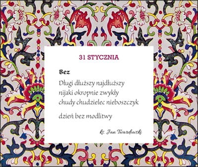 Opis: Ubogać swą codzienność niezwykłym codziennikiem! Kolejny z serii przepięknych i inspirujących codzienników Edycji Świętego Pawła. Tym razem każdego dnia do modlitwy zapraszać będzie ks. Jan Twardowski, mistrz słowa trafiającego w serca i umysły ludzi niezależnie od wyznawanych poglądów. Wyboru i opracowania tekstów na 365 dni dokonała Aleksandra Iwanowska, edytorka twórczości księdza Jana. Dopełnieniem starannie wyselekcjonowanych myśli zbliżających do Boga jest grafika – subtelna, przemyślanie dobrana, pełna kolorowych ornamentów. Codziennik łączy w sobie wiele funkcji: kalendarza, motywatora i przepięknej ozdoby. Świetnie sprawdzi się jako niebanalny, a cieszący oko prezent dla bliskiej osoby.