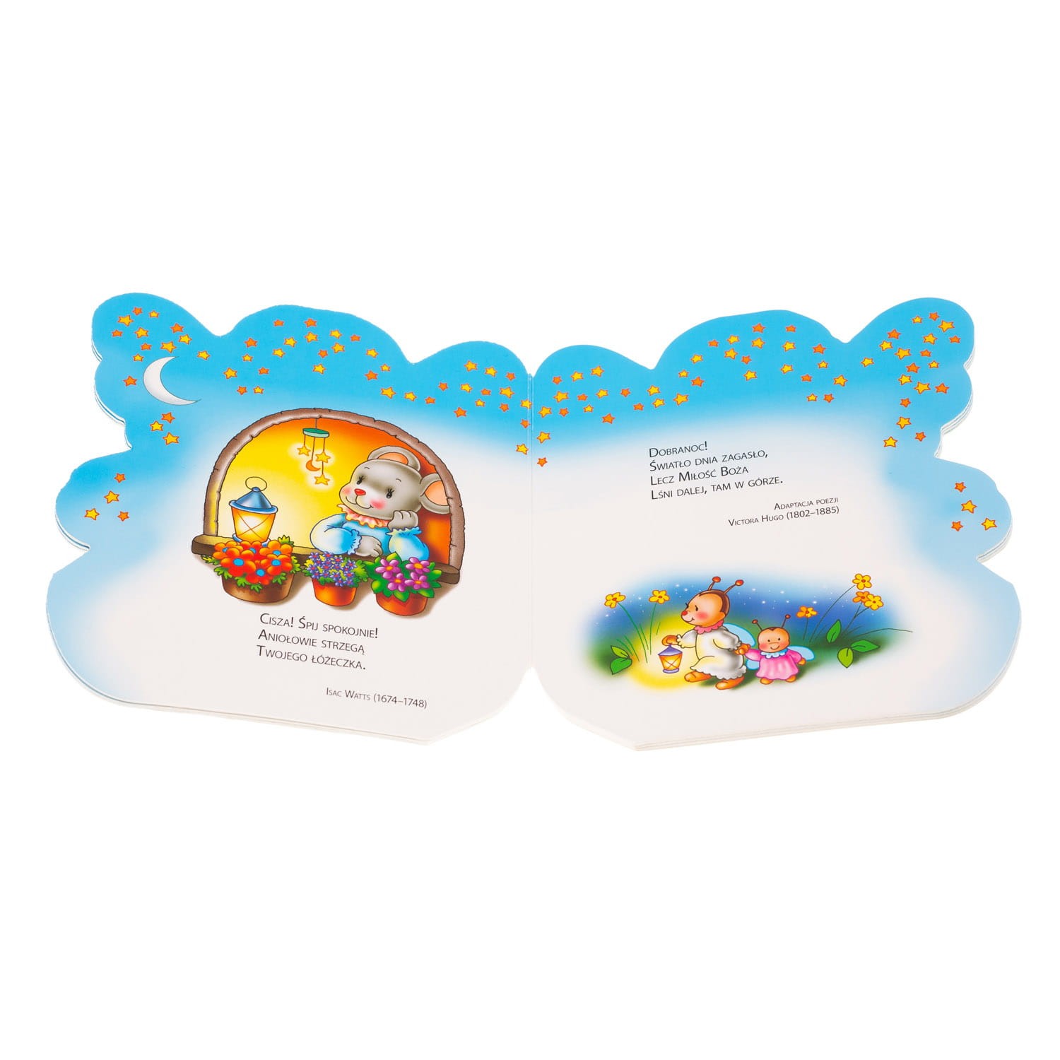 Kolorowa książeczka w kształcie anioła, to zbiór najpiękniejszych modlitw chwalebnych dla dzieci. Oryginalna oprawa i piękne ilustracje przykują uwagę każdego dziecka i zachęcą do nauki modlitwy.