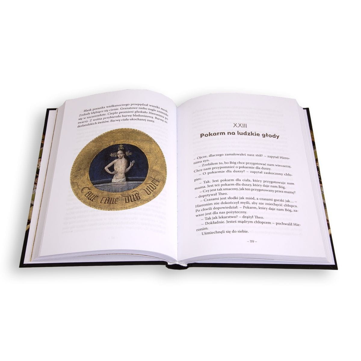 Osnową i spoiwem powieści jest obraz “Stół Mądrości”, suto zastawiony niezwykłymi potrawami, jak pycha, chciwość, nieczystość, zazdrość, nieumiarkowanie, gniew, lenistwo, a także cztery rzeczy ostateczne: śmierć, sąd Boży, piekło, niebo.