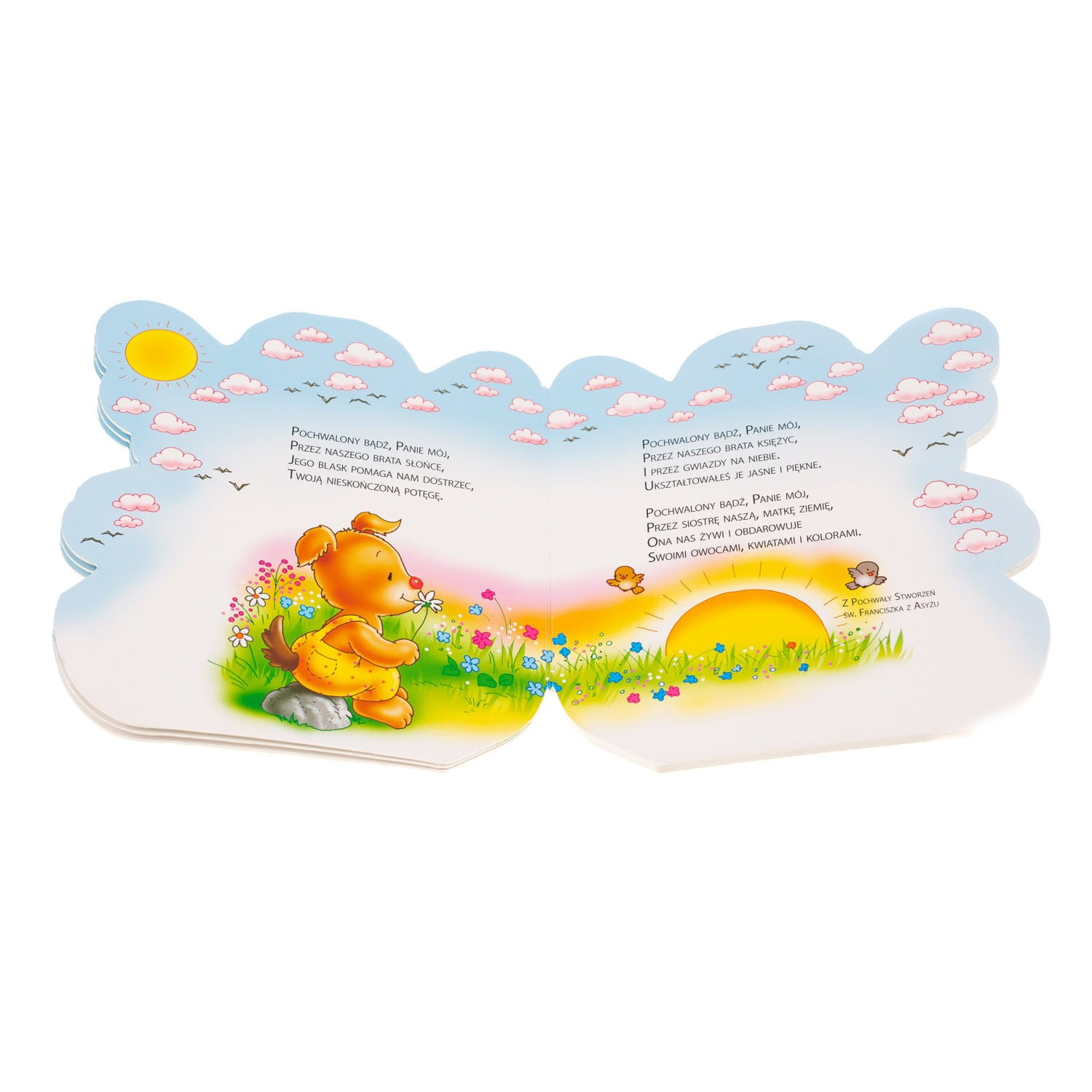 Kolorowa książeczka w kształcie anioła, to zbiór najpiękniejszych modlitw chwalebnych dla dzieci. Oryginalna oprawa i piękne ilustracje przykują uwagę każdego dziecka i zachęcą do nauki modlitwy.