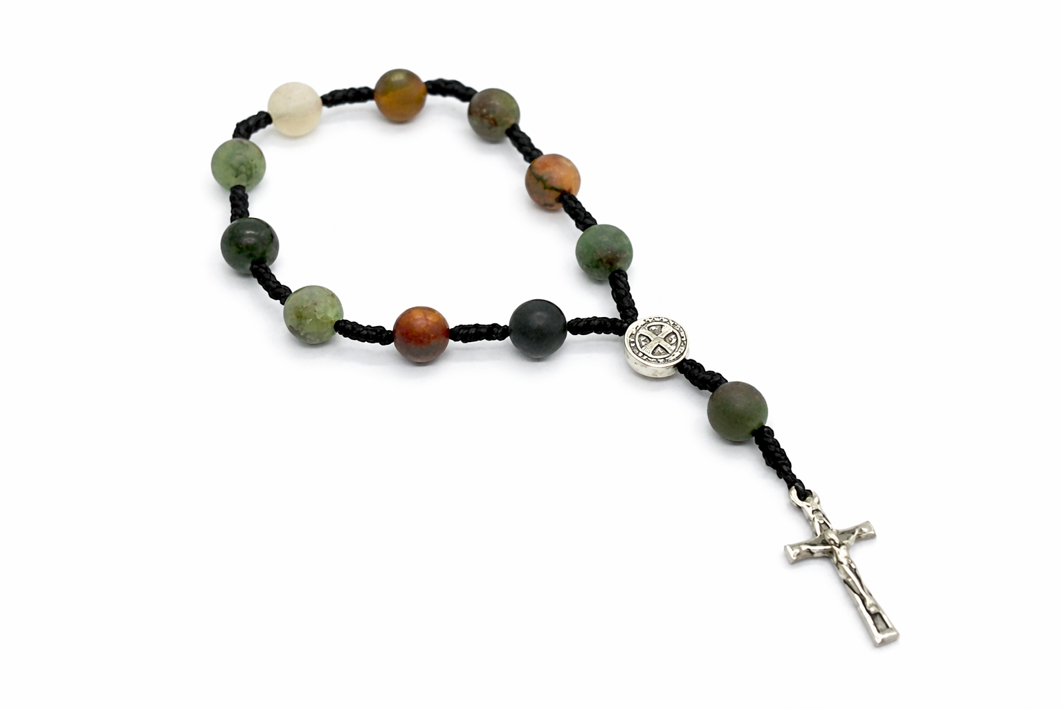Paciorki z naturalnego Heliotropu mają piękną, matową strukturę i charakterystyczne, ziemiste odcienie zieleni, brązów i rudości. Każdy koralik jest inny — to cecha kamieni naturalnych, która czyni różaniec absolutnie niepowtarzalnym.
