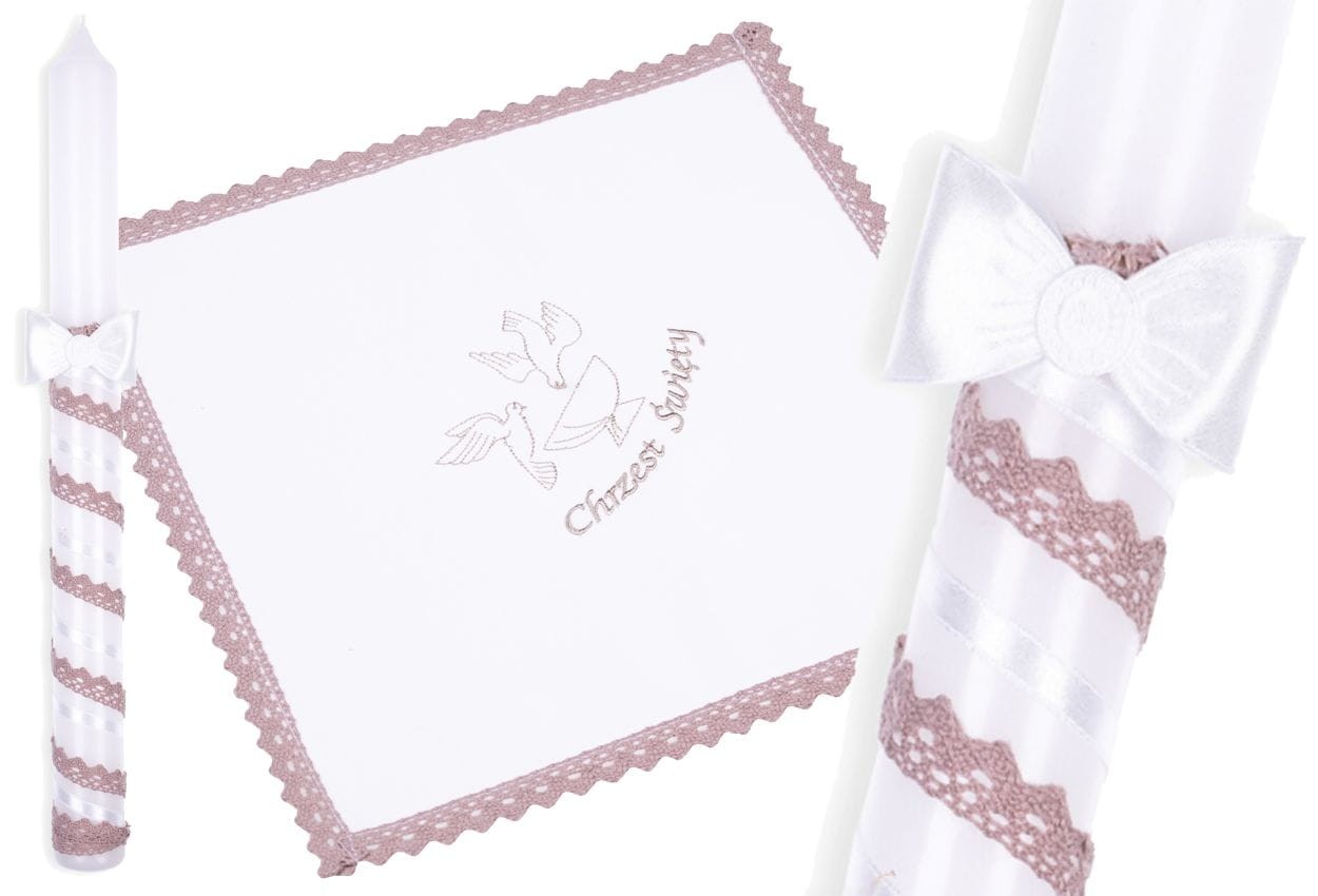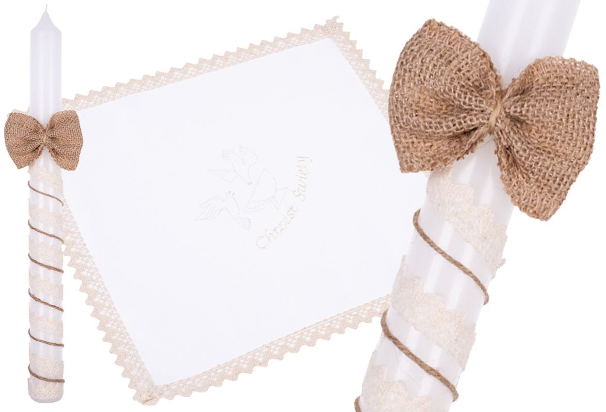Eko zestaw KOLORY ZIEMI ♻ ŚWIECA I SZATKA z haftem - Pamiątka Chrztu Gromnica na Chrzest
