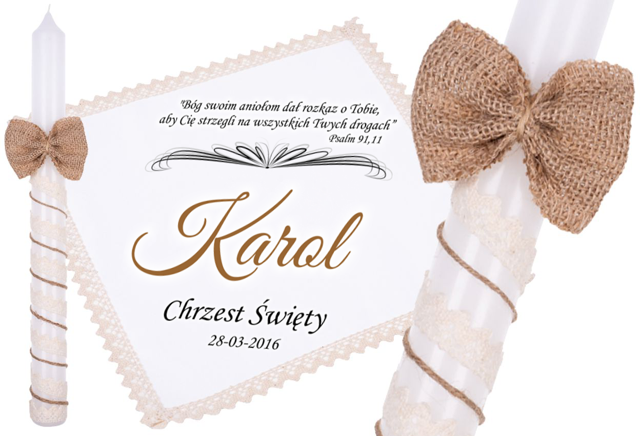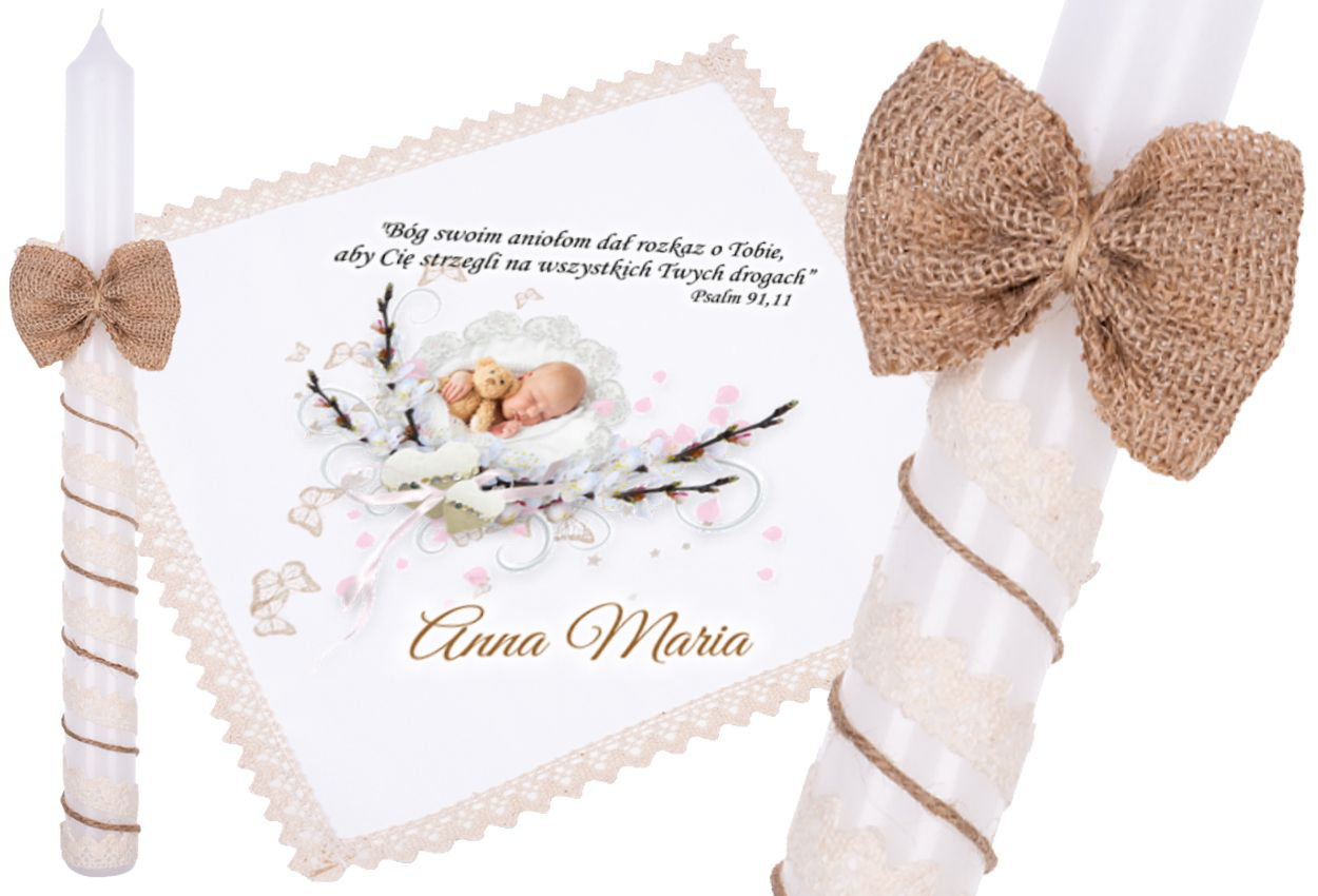 Niezapomniana pamiątka z okazji Sakramentu Chrztu Świętego. Komplet na Chrzest Święty składa się ze świecy oraz szatki. Świeca udekorowana została koronką bawełnianą w wyjątkowych kolorach Ziemi do wyboru: "piasek pustyni" lub "ziemia Afryki" oraz wstążką z materiału jutowego, co sprawia, że zestaw jest wykonany z ekologicznych materiałów. To najlepszy sposób na ukłon w stronę środowiska, a także jak najbardziej efektywne wykorzystanie materiałów. Szatka doskonale pasuje do świecy, obszyta jest tą samą koronka.