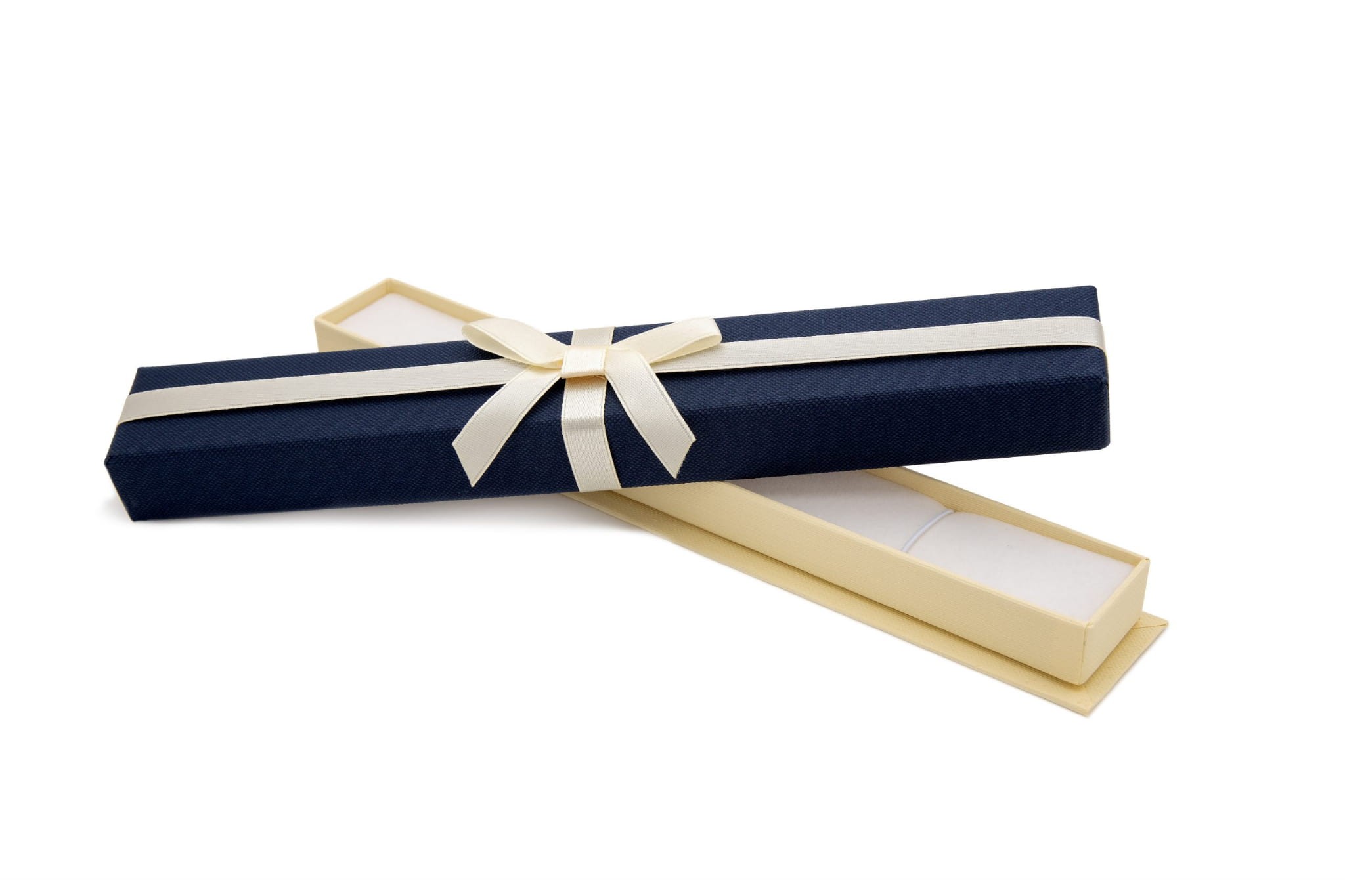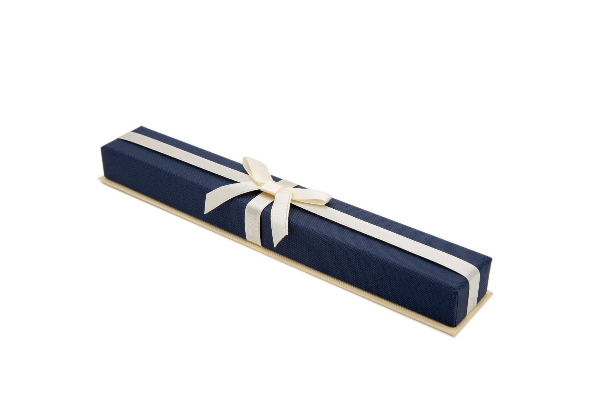 Etui tekturowe z kokardką podłużne jest eleganckim opakowaniem jubilerskim tekturowym wykonanym z najwyższej jakości papieru. Do opakowania pasują wyroby jubilerskie takie jak: bransoletki, łańcuszki, naszyjniki, różańce a nawet kolie i różańce Gąbka w środku opakowania jest specjalnie skonstruowana, żeby mogła bezpiecznie przetrzymywać wymienioną biżuterie – posiada dwie gumki które zapewniają, że przetrzymywana biżuteria nie przemieści się w środku opakowania.