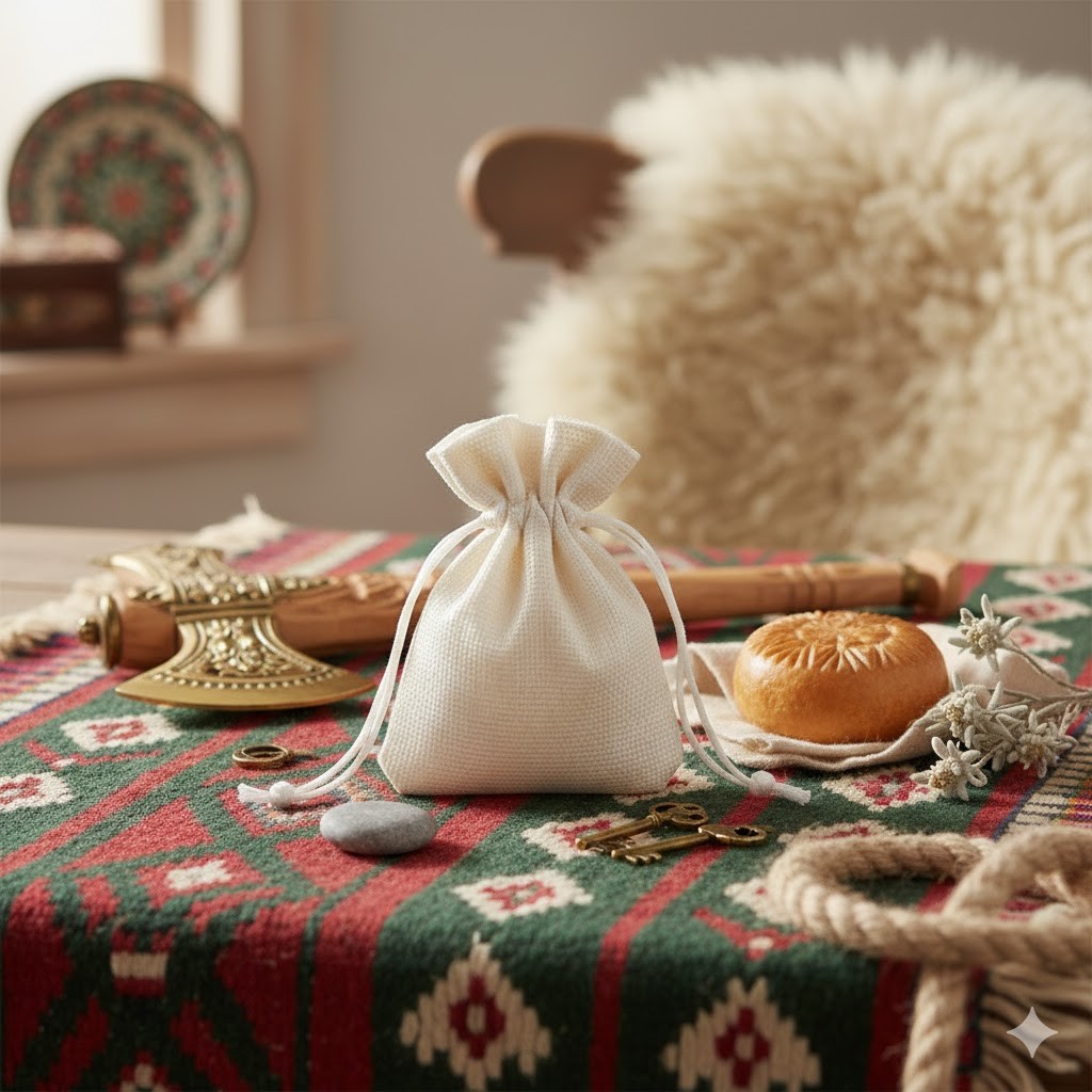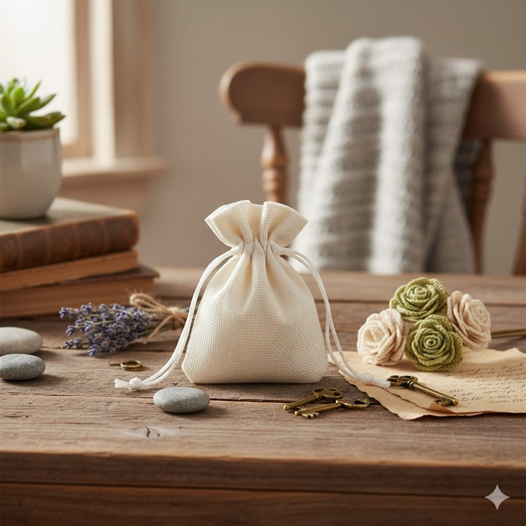 Włóż przedmiot (np. różaniec, medal, zawieszkę) do etui i ściągnij sznureczek, by zabezpieczyć zawartość. Przechowuj w suchym miejscu.