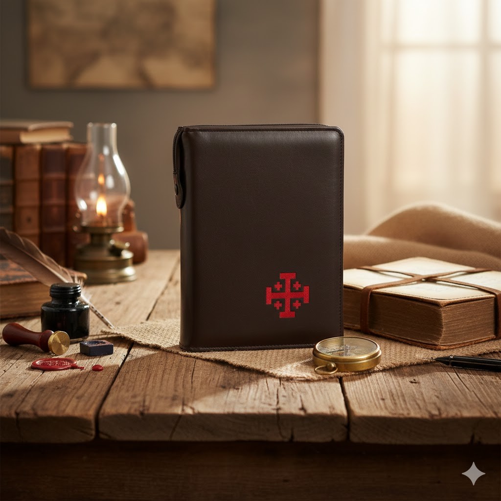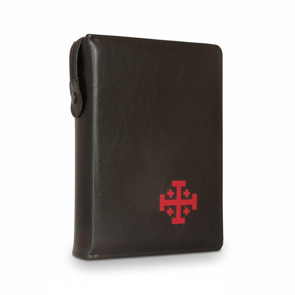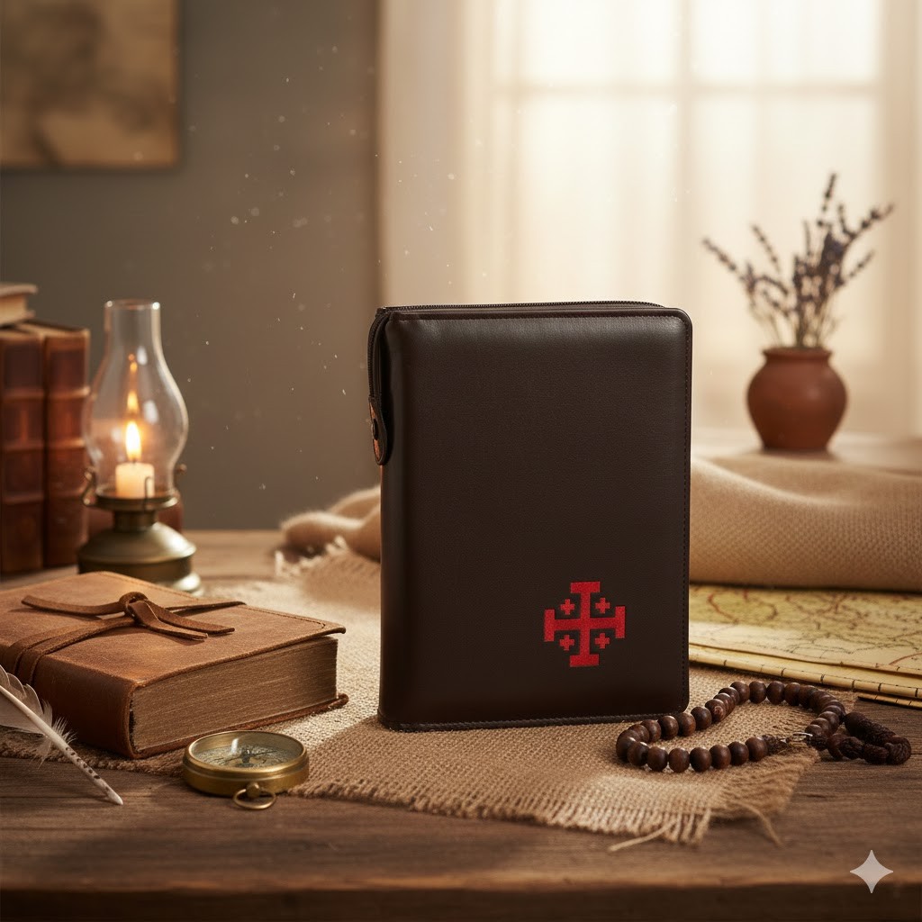Praktyczne i eleganckie etui stworzone z myślą o ochronie Biblii Jerozolimskiej. Wykonane z wysokiej jakości czarnej eko-skóry, łączy w sobie trwałość, estetykę oraz wygodę użytkowania. Na froncie widnieje czerwony haft Krzyża Jerozolimskiego – symbol wiary, misji chrześcijańskiej i obecności Słowa Bożego w naszym życiu.