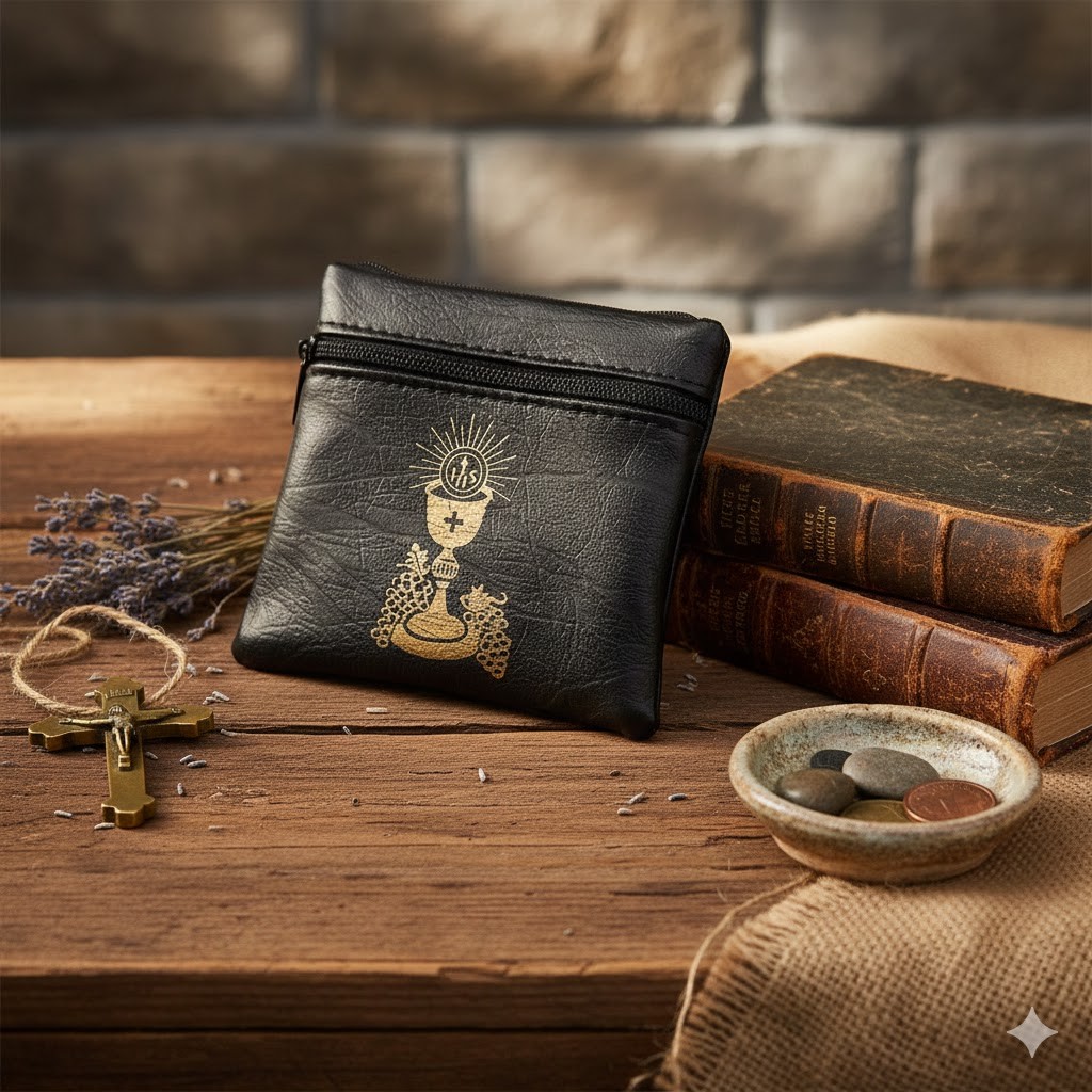 Na froncie znajduje się eucharystyczny motyw hostii z IHS, dlatego etui świetnie pasuje jako dodatek do komunijnego różańca i pamiątki Pierwszej Komunii Świętej. Jednocześnie pozostaje uniwersalne — sprawdzi się dla dzieci, młodzieży i dorosłych, którzy chcą mieć różaniec zawsze bezpiecznie schowany.