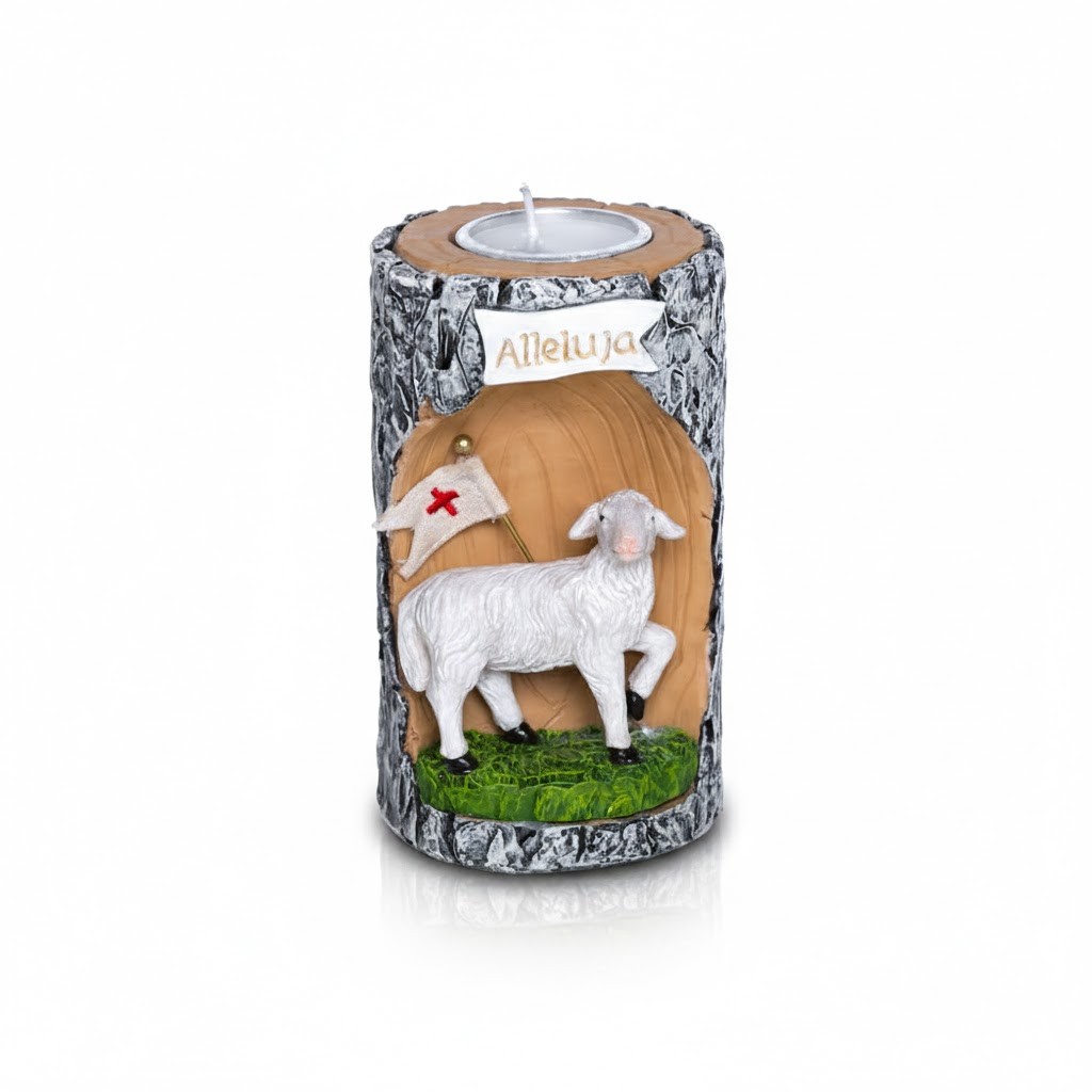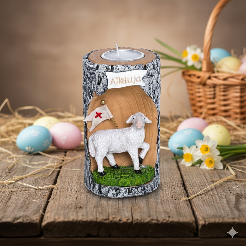 Figurka baranka wielkanocnego z funkcją świecznika to klasyczny symbol Zmartwychwstania Chrystusa oraz zwycięstwa dobra nad złem. Przedstawienie baranka z chorągiewką i napisem „Alleluja” nawiązuje do Chrystusa jako Baranka Bożego, który oddał życie za zbawienie świata.