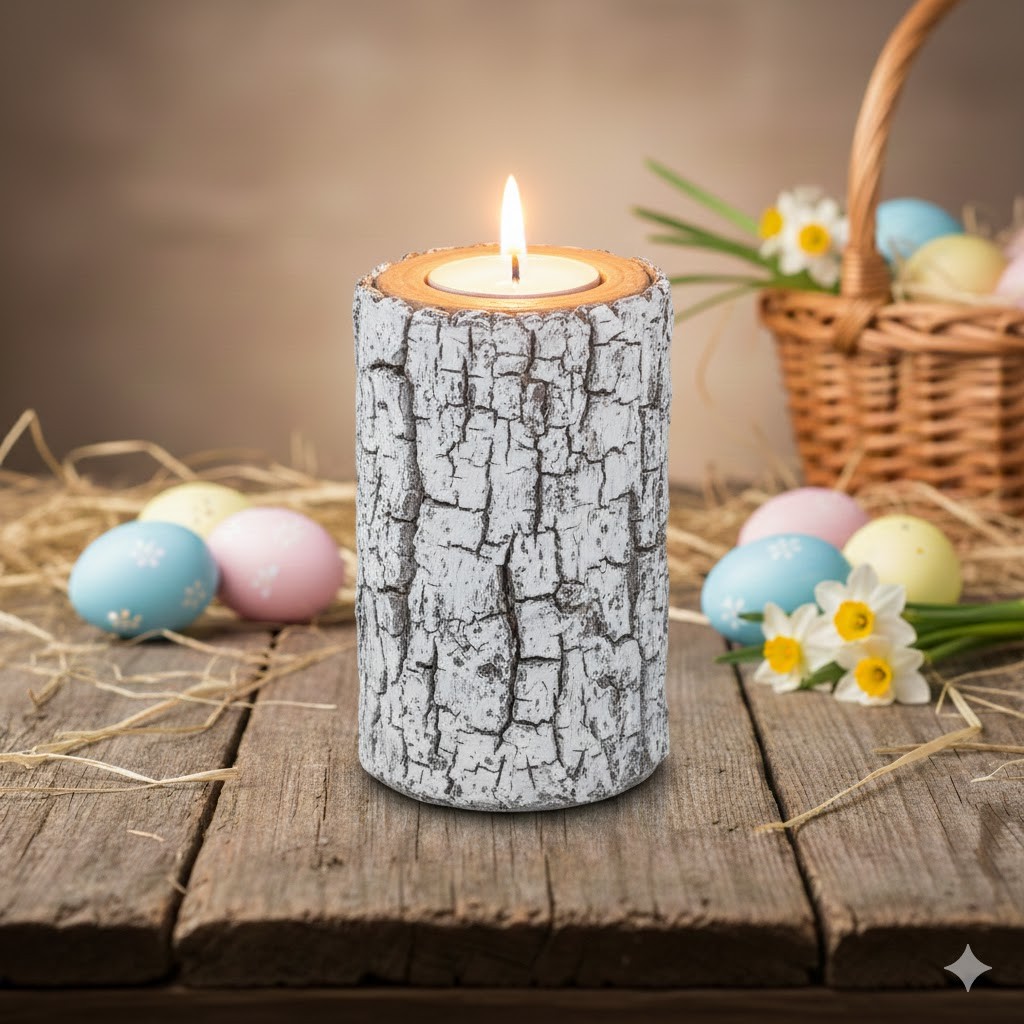 Wykonana z trwałej żywicy figurka charakteryzuje się starannym odwzorowaniem detali oraz harmonijną kolorystyką. Forma przypominająca wydrążony pień podkreśla naturalny i symboliczny charakter dekoracji, dobrze wpisując się w wielkanocne aranżacje wnętrz.