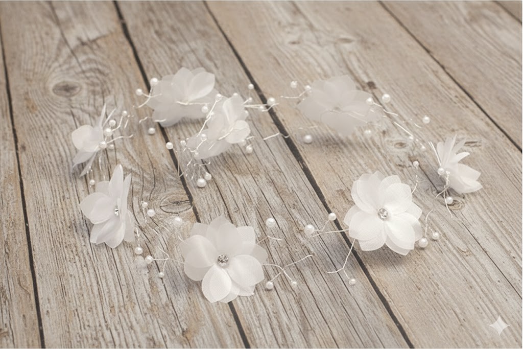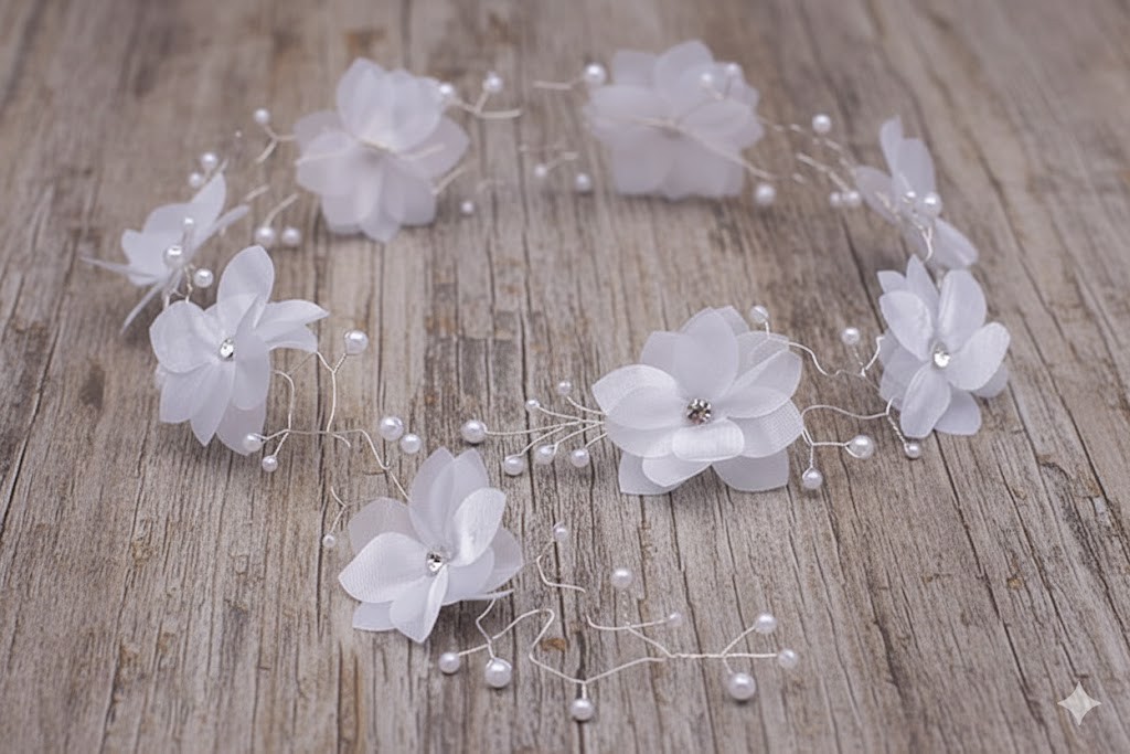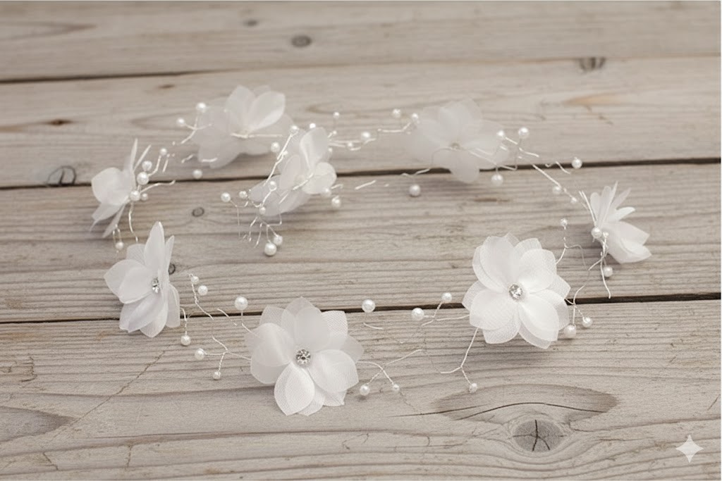 Gałązka komunijna z tiulowymi kwiatami i perełkami to wyjątkowo delikatna i elegancka ozdoba do włosów, stworzona z myślą o klasycznych stylizacjach na Pierwszą Komunię Świętą. Zwiewne, półtransparentne kwiaty połączone z drobnymi perełkami i subtelnymi kryształkami tworzą lekką, harmonijną kompozycję o uroczystym charakterze.