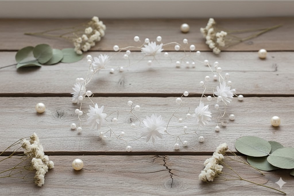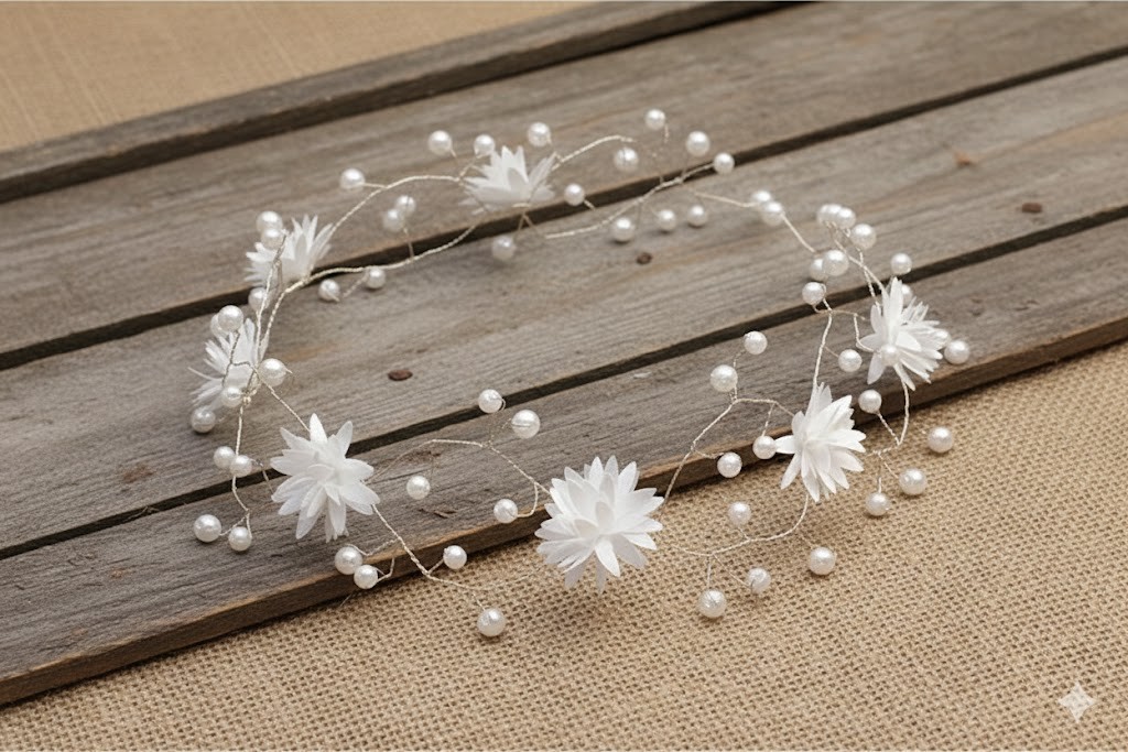 Gałązka komunijna z drobnymi białymi kwiatami i perłowymi akcentami to wyjątkowo subtelna ozdoba do włosów, stworzona z myślą o delikatnych, eleganckich stylizacjach komunijnych. Lekka kompozycja oparta na cienkich gałązkach z perełkami i transparentnymi elementami nadaje fryzurze świeżości, lekkości i uroczystego charakteru.