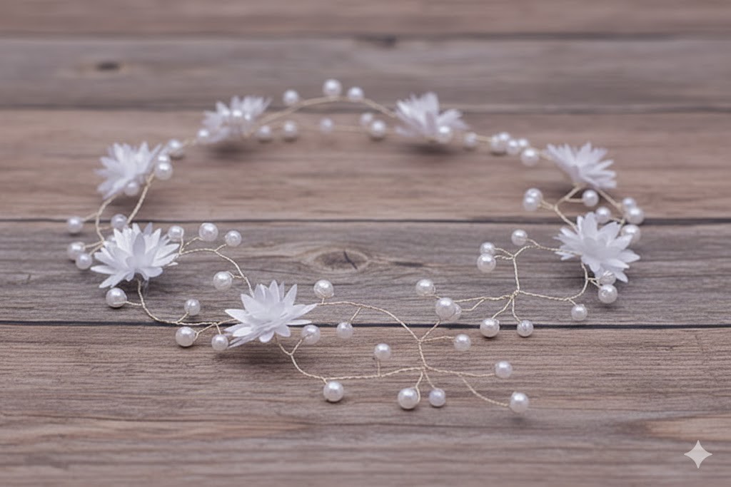 Ta gałązka komunijna to połączenie lekkości, delikatności i elegancji. Drobne kwiaty i perełki tworzą ozdobę, która pięknie dopełnia komunijną fryzurę, podkreślając jej uroczysty, a jednocześnie naturalny charakter.