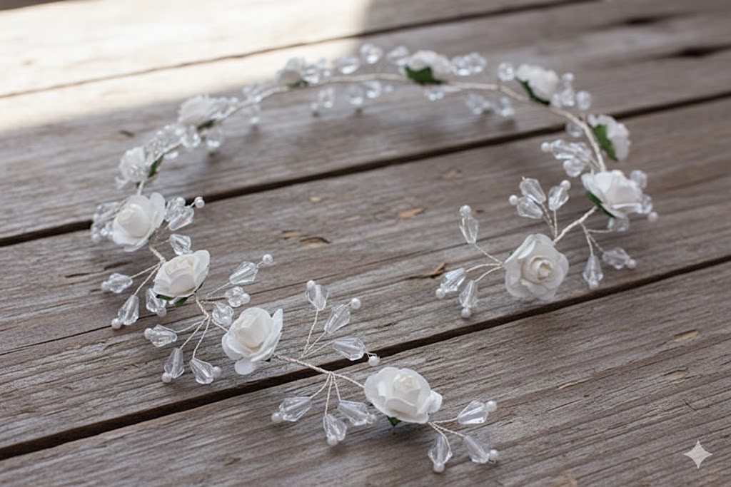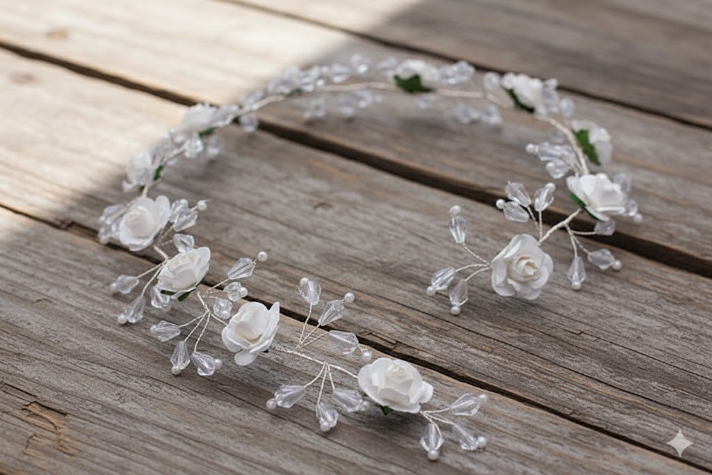 Gałązka komunijna z białymi różyczkami i transparentnymi kryształkami to wyjątkowo elegancka i subtelna ozdoba do włosów, inspirowana delikatną biżuterią. Połączenie drobnych kwiatów, przezroczystych elementów oraz subtelnych perełek tworzy lekką, harmonijną kompozycję, która pięknie podkreśla uroczysty charakter Pierwszej Komunii Świętej.