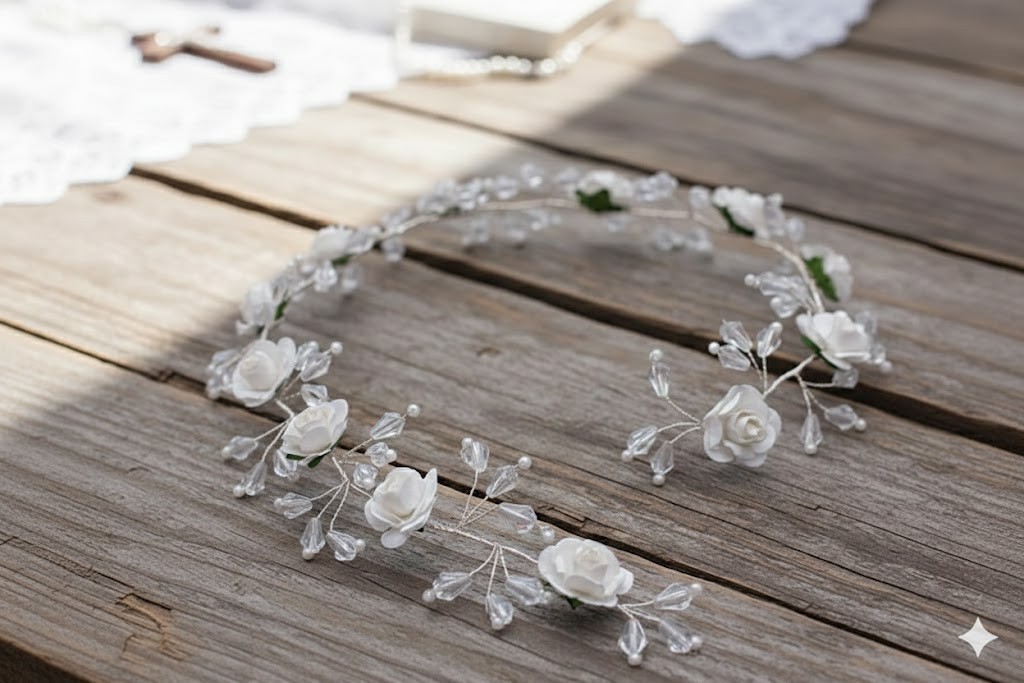 Ta gałązka komunijna to połączenie subtelnej biżuterii i klasycznej elegancji. Białe różyczki oraz transparentne kryształki tworzą ozdobę, która pięknie dopełnia komunijną fryzurę, zachowując lekki i uroczysty charakter.