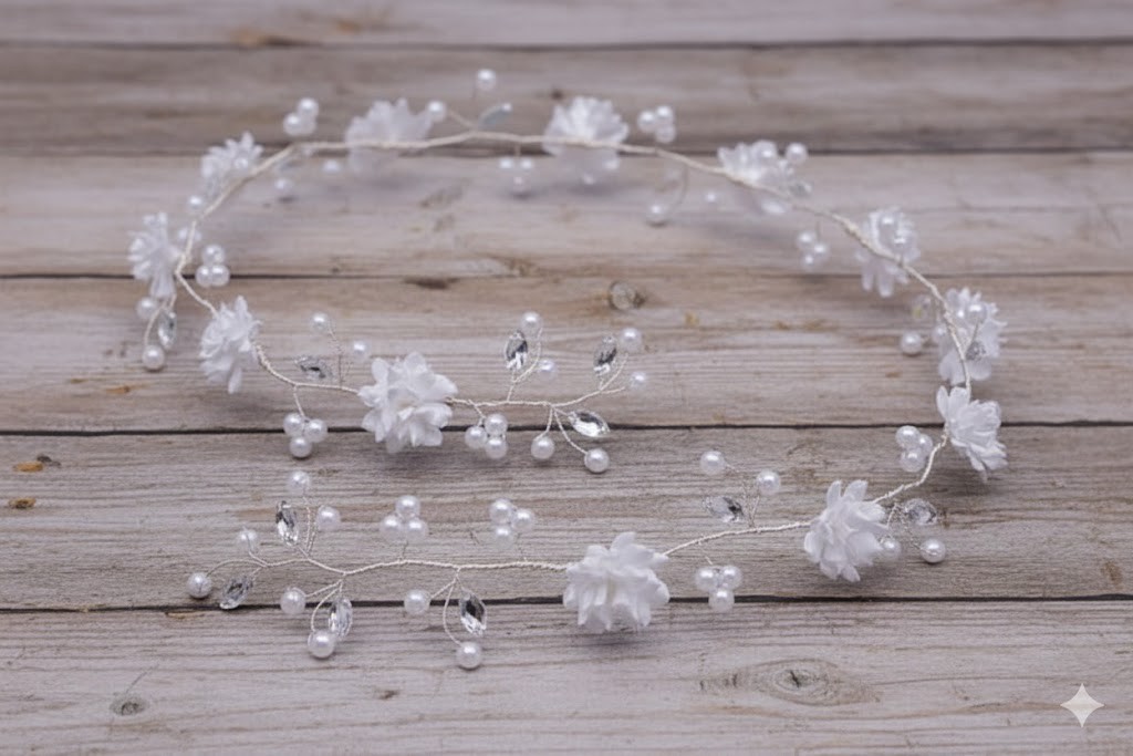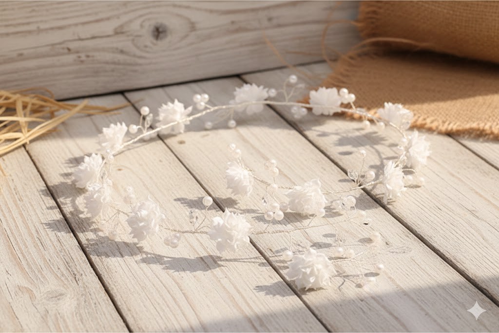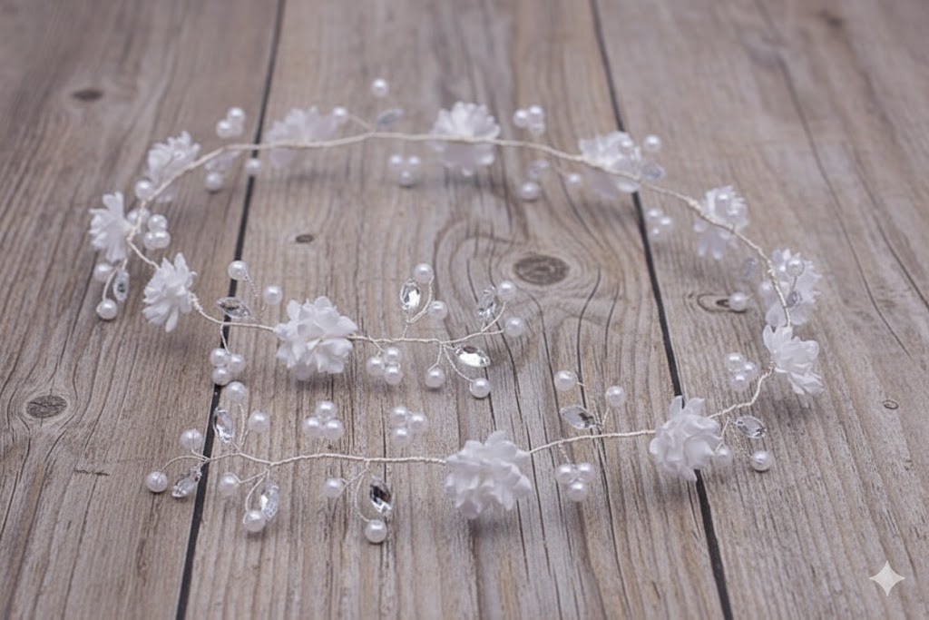 Ta gałązka komunijna to połączenie lekkości, subtelności i elegancji. Delikatne kwiaty i perełki tworzą wyjątkową ozdobę, która pięknie dopełnia komunijną fryzurę, nie dominując stylizacji, a jedynie ją podkreślając.