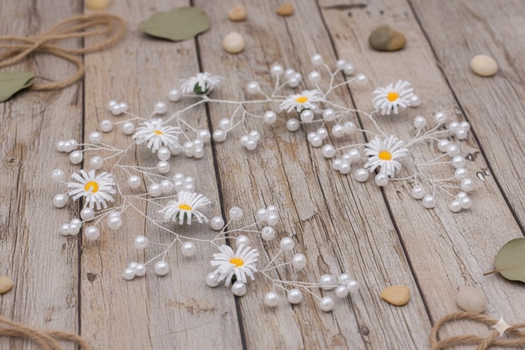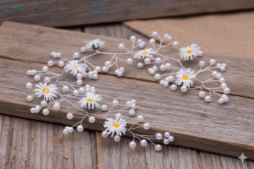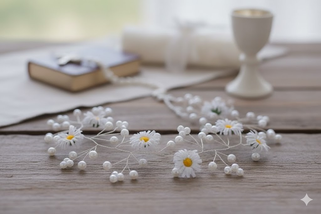 Gałązka komunijna z motywem stokrotek to wyjątkowo lekka i dziewczęca ozdoba do włosów, idealna jako alternatywa dla klasycznego wianka. Delikatne białe kwiaty z żółtym środkiem połączone z perłowymi akcentami tworzą świeżą, naturalną kompozycję doskonale wpisującą się w uroczysty charakter Pierwszej Komunii Świętej.