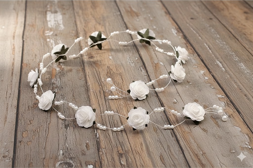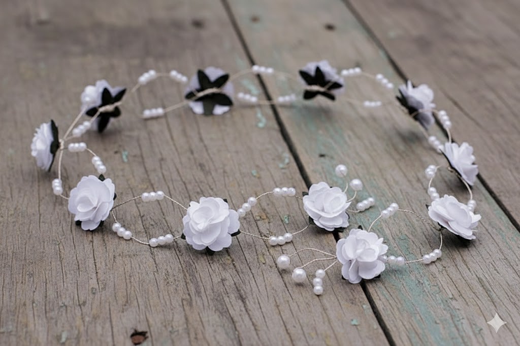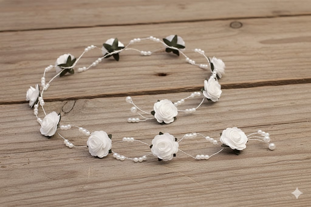 Gałązka komunijna z białymi różyczkami i perłowymi zdobieniami to elegancka i ponadczasowa ozdoba do włosów, idealna na uroczystość Pierwszej Komunii Świętej. Kompozycja oparta na delikatnych kwiatach, subtelnych perełkach oraz stonowanych, zielonych listkach tworzy harmonijną całość o klasycznym i dziewczęcym charakterze.