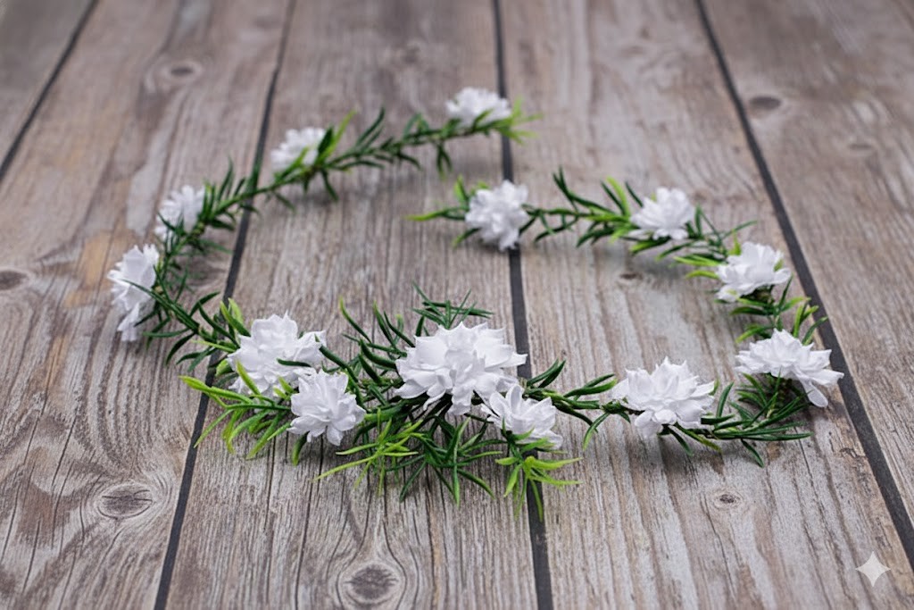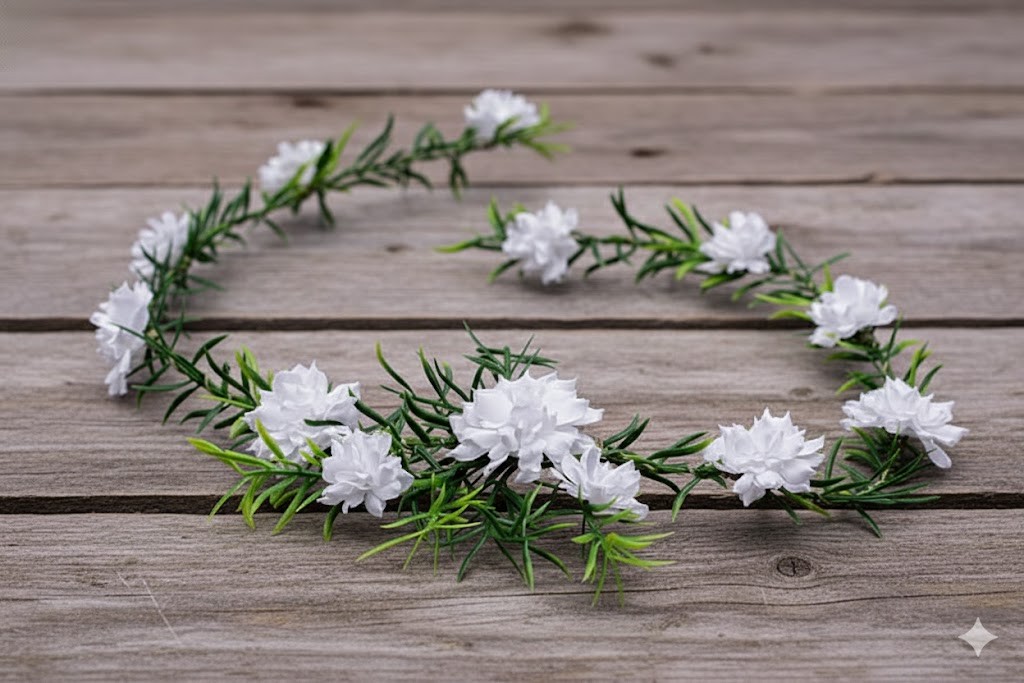 Ta gałązka komunijna to połączenie naturalnej prostoty i elegancji. Białe kwiaty i zielone listki tworzą subtelną ozdobę, która pięknie dopełnia komunijną fryzurę, zachowując lekki i harmonijny charakter stylizacji.